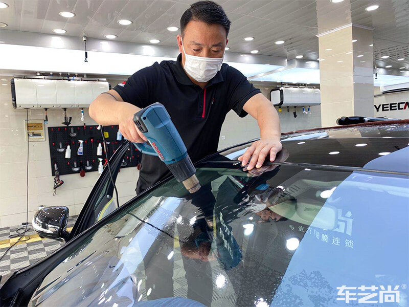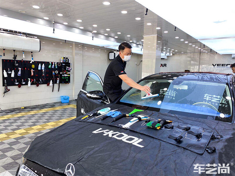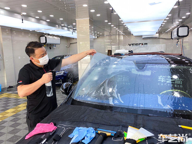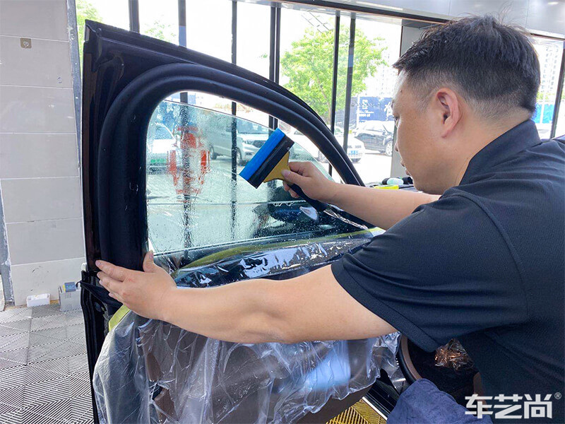 车艺尚技师不同施工部位采用不同的赶水手法与工具,确保膜与玻璃的充分贴合,无气泡、无翘边。