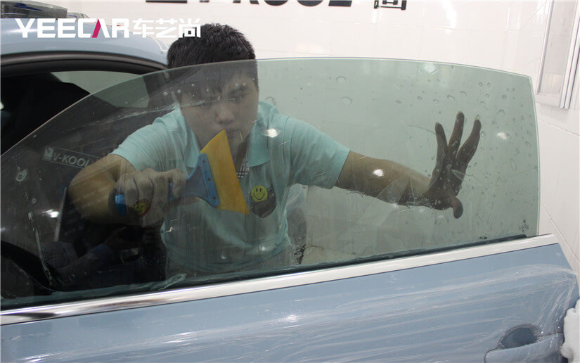 ● 前挡贴膜赶水,利用工具将多余的水赶出来,使玻璃与膜粘合