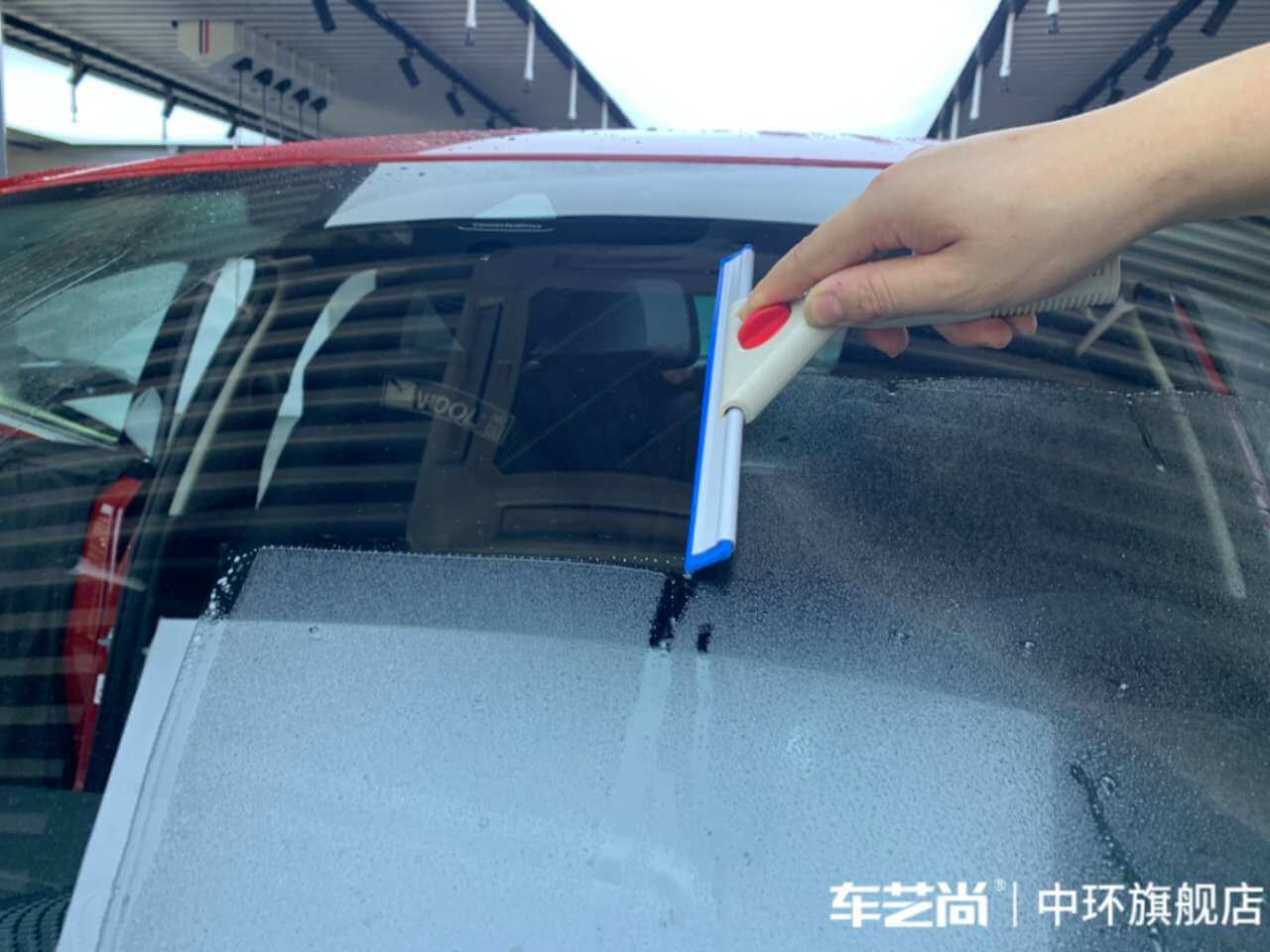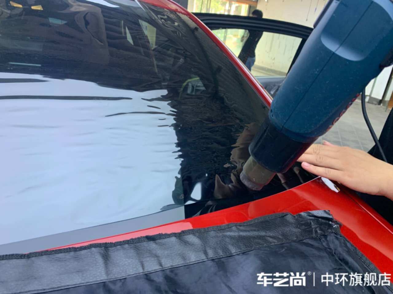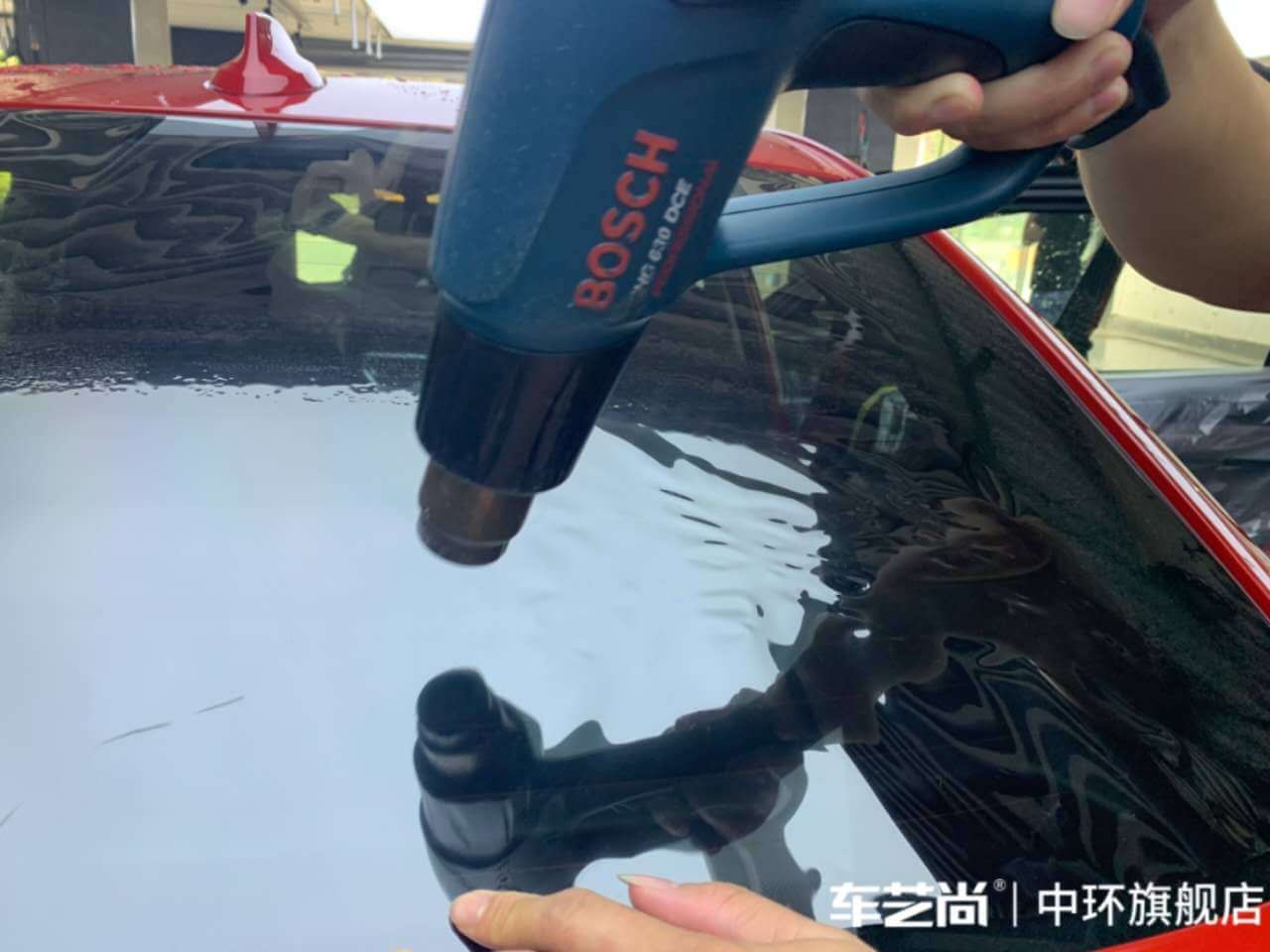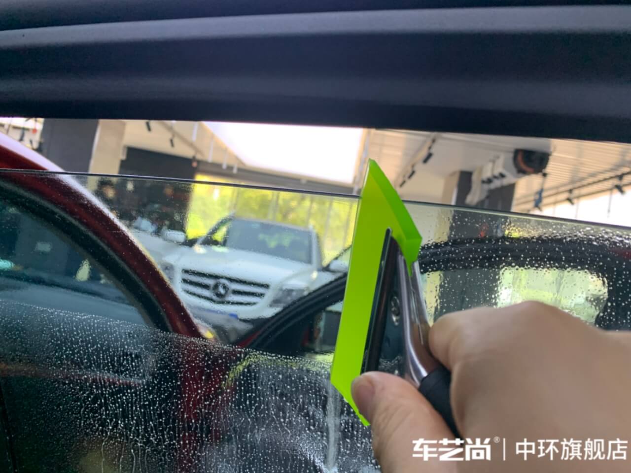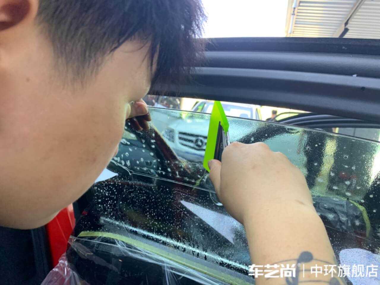 车艺佳技师不同施工部位采用不同的赶水手法与工具,确保膜与玻璃的充分贴合,无气泡、无翘边。