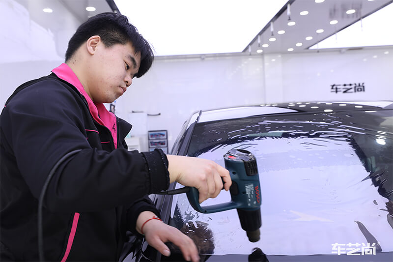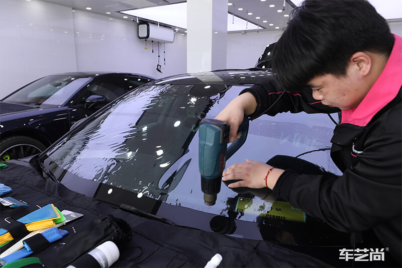 车艺尚技师不同施工部位采用不同的赶水手法与工具,确保膜与玻璃的充分贴合,无气泡、无翘边。