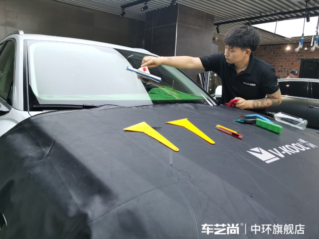 车艺尚技师不同施工部位采用不同的赶水手法与工具,确保膜与玻璃的充分贴合,无气泡、无翘边。
