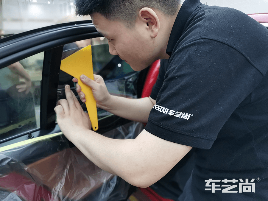 车艺尚技师不同施工部位采用不同的赶水手法与工具,确保膜与玻璃的充分贴合,无气泡、无翘边。