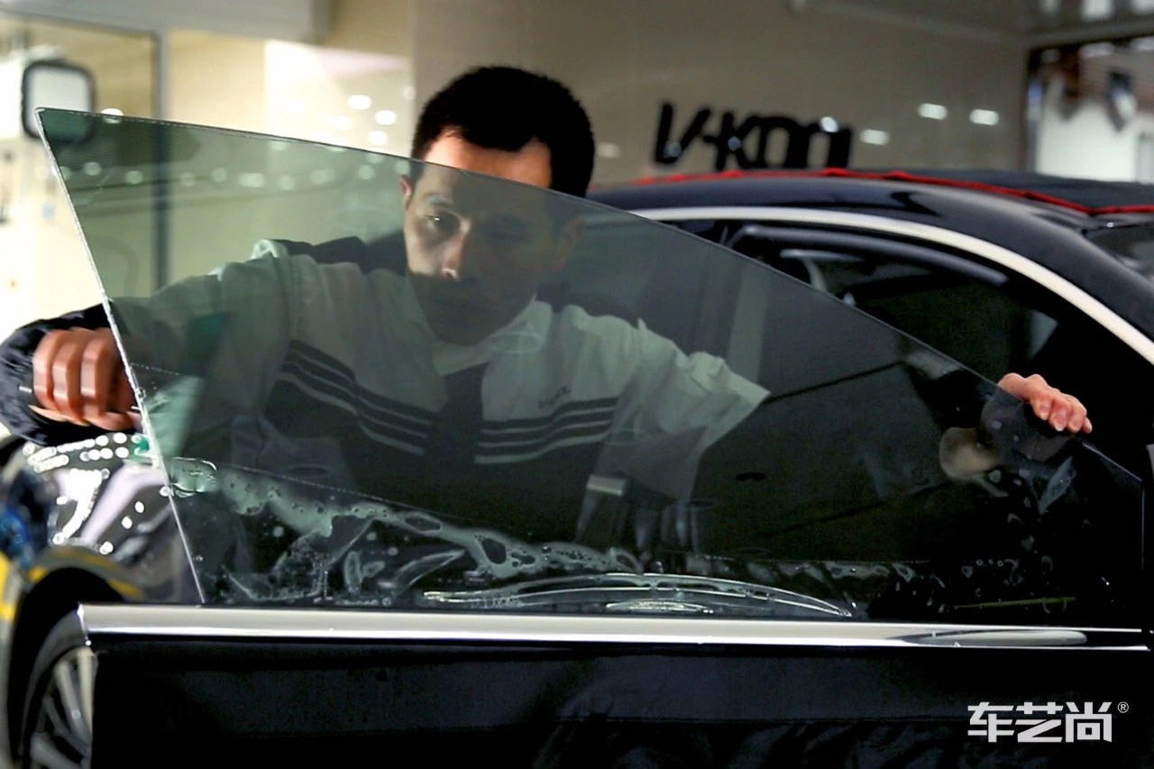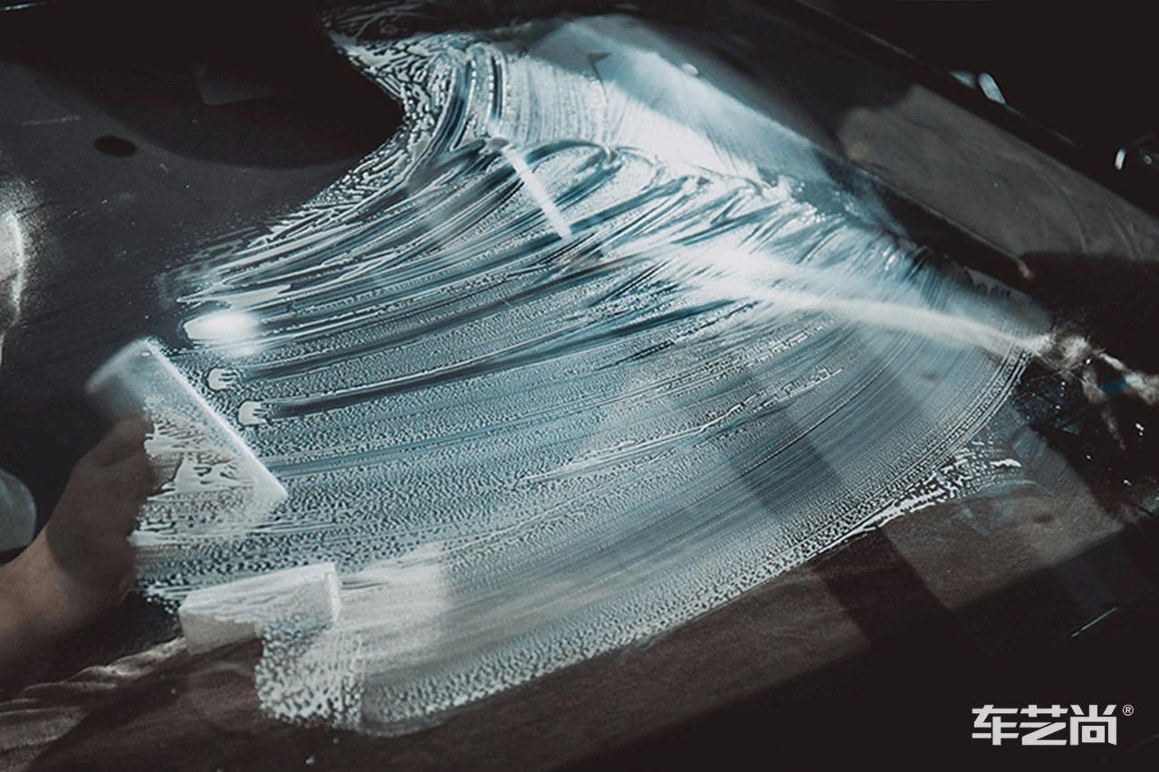 车艺尚技师不同施工部位采用不同的赶水手法与工具,确保膜与玻璃的充分贴合,无气泡、无翘边。