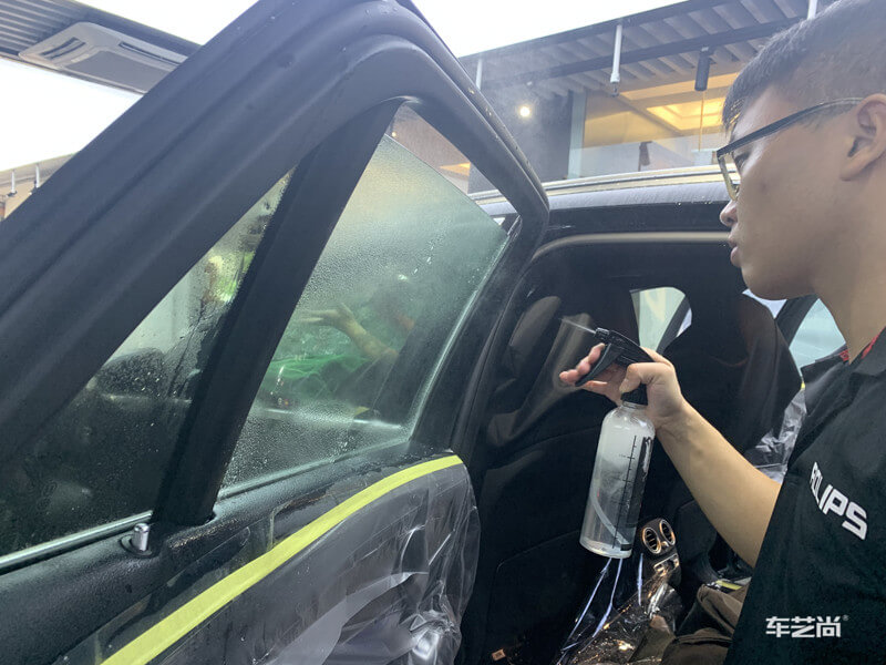 车艺尚贴膜技师在施工中采用500ML微水施工(市面上一般采用3000ML,甚至更大的用水量),避免因为用水过多对内饰、仪表盘、真皮座椅、电路系统等引起受潮发霉或短路危险。