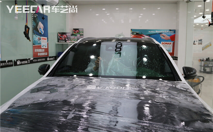 ● 贴膜前清洁玻璃也是必不可少的,车艺尚采用微水贴膜,也会在贴膜施工前在仪表台上铺上保护套,防止中控内饰进水受潮