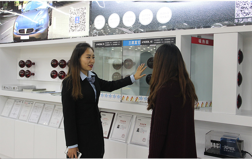 ● 膜是贴在玻璃里面的,但是在贴膜之前需要先把膜烤成与车玻璃贴合的弧度再拿到车内装贴