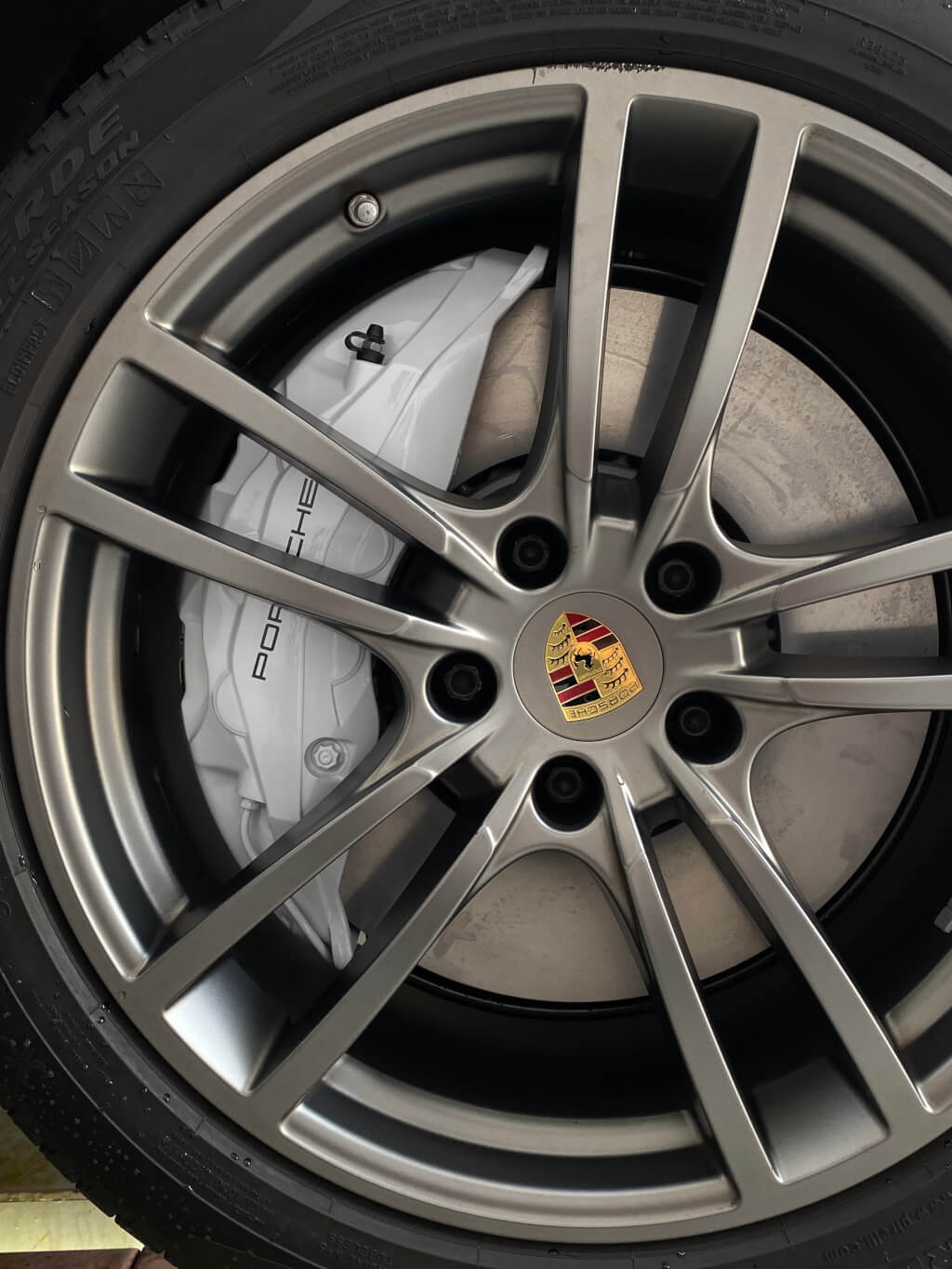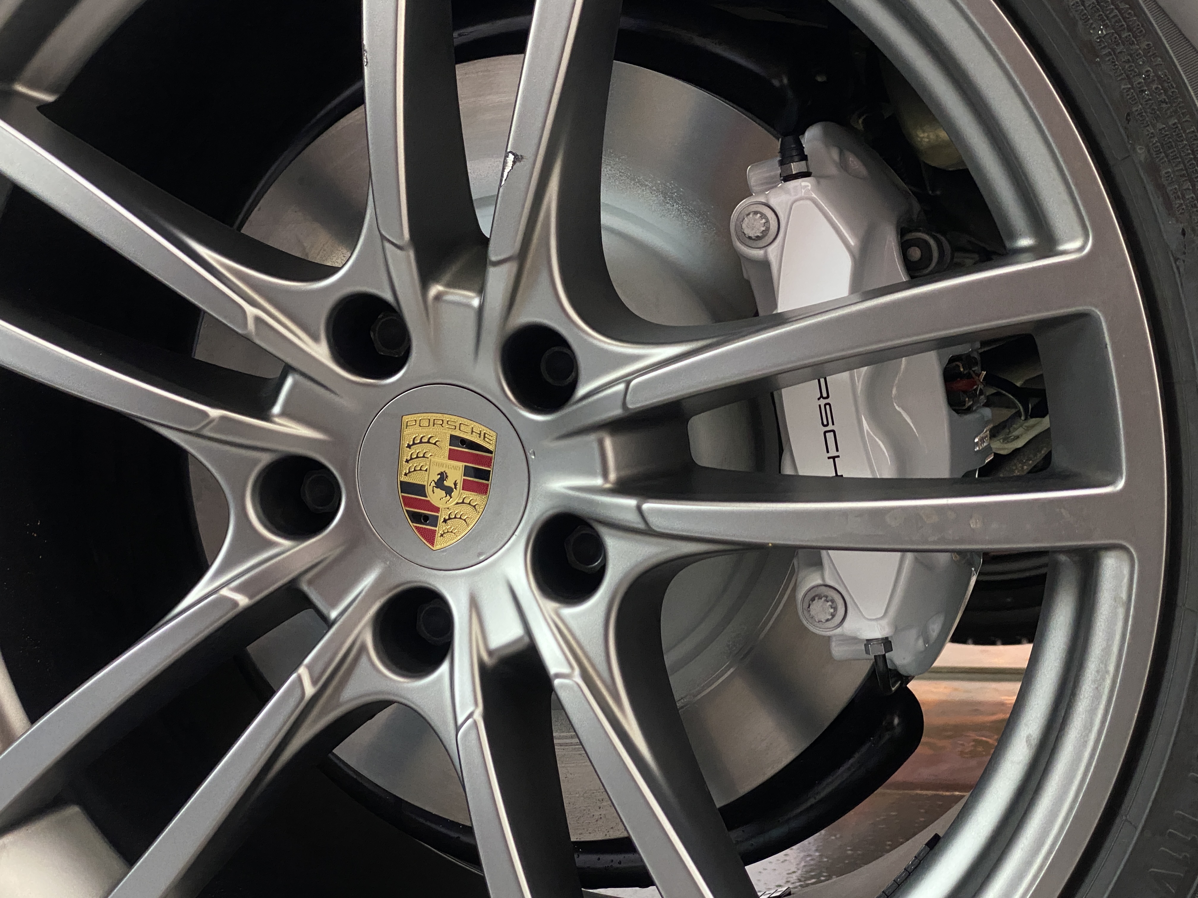 PSCB(Porsche Surface Coated Brakes),是仅次于天价碳陶的保时捷原厂刹车,其中刹车盘主要原料是碳化钨,碳化钨的强度约为钢的2倍,是喷气式发动机的重要部件材料之一,其硬度可想而知。保时捷官方表示PSCB能够提高30%寿命,以及减少90%的刹车粉尘。最直接的效果就是让选配的轮圈永远干净透亮。更有意思的是,当行驶超过600km左右之后,碳化钨涂层的刹车盘会呈现出镜面效果,在阳光下如钻石般闪耀,光彩夺目。