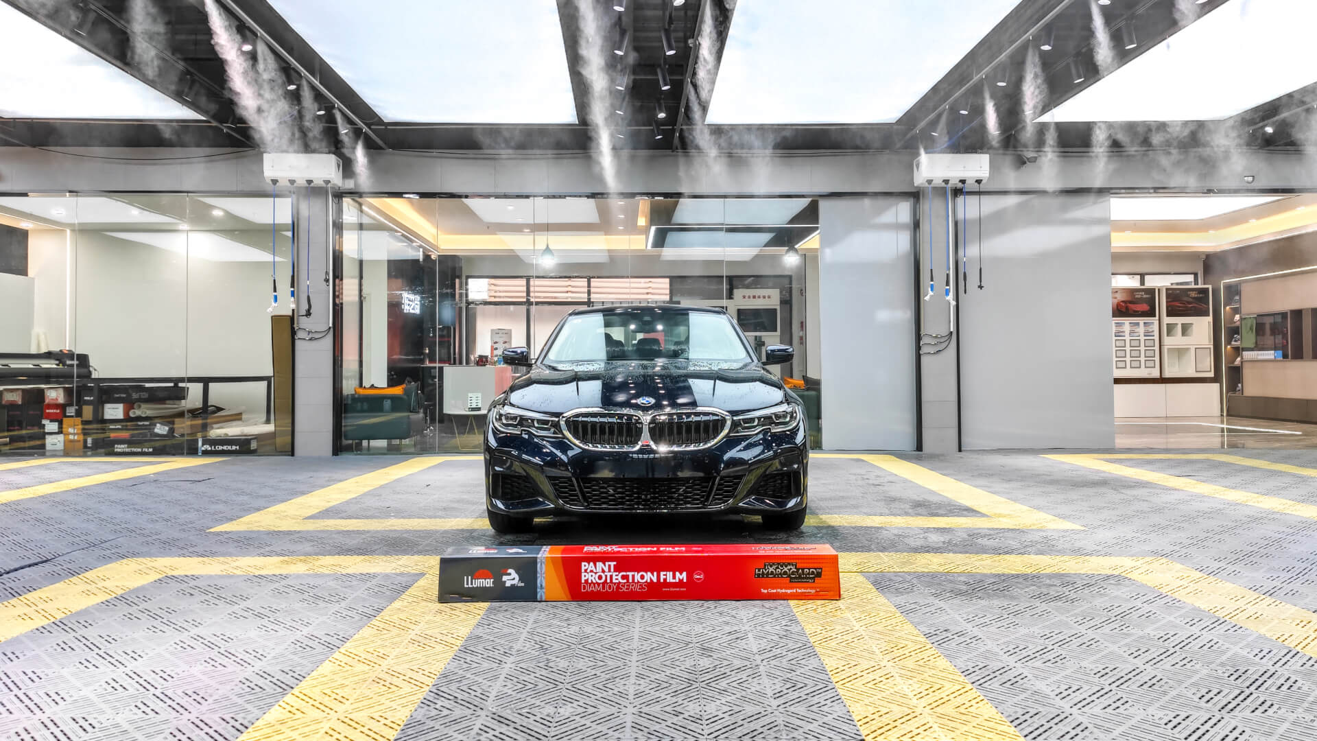 店内施工间顶灯设计采用喷淋装置安全间距外的全照明设计风格,可以为贴膜提供360°无影光源,无论在清洁车身、贴膜施工,还是在最终的验收复检环节,都可以达到最大限度的无死角照明。