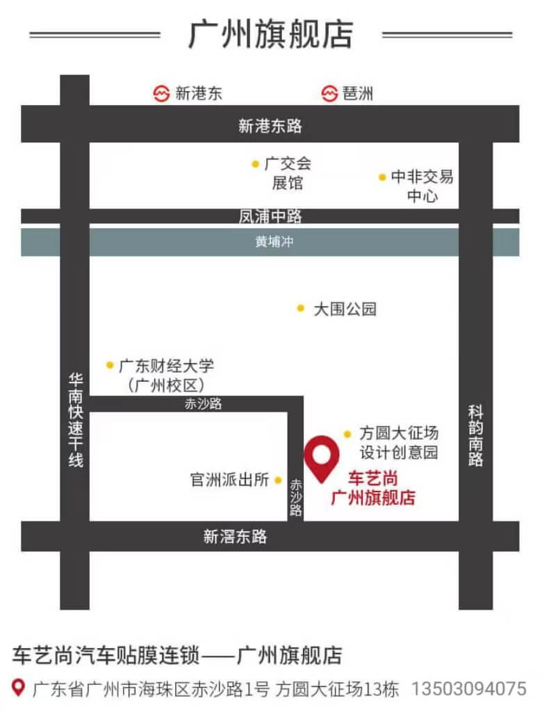 车艺尚广州旗舰店作为车艺尚在广州的第二家直营门店,地理位置优越,位于广东省广州市海珠区赤沙路1号,方圆大征场13栋。车艺尚广州旗舰店专注于提供龙膜的隔热膜和隐形车衣的官方销售和施工服务,满足品质追求的车主对车辆保护和性能提升的需求。在这里,您将能够获得车艺尚品牌的专业服务和精心挑选的优质产品。
