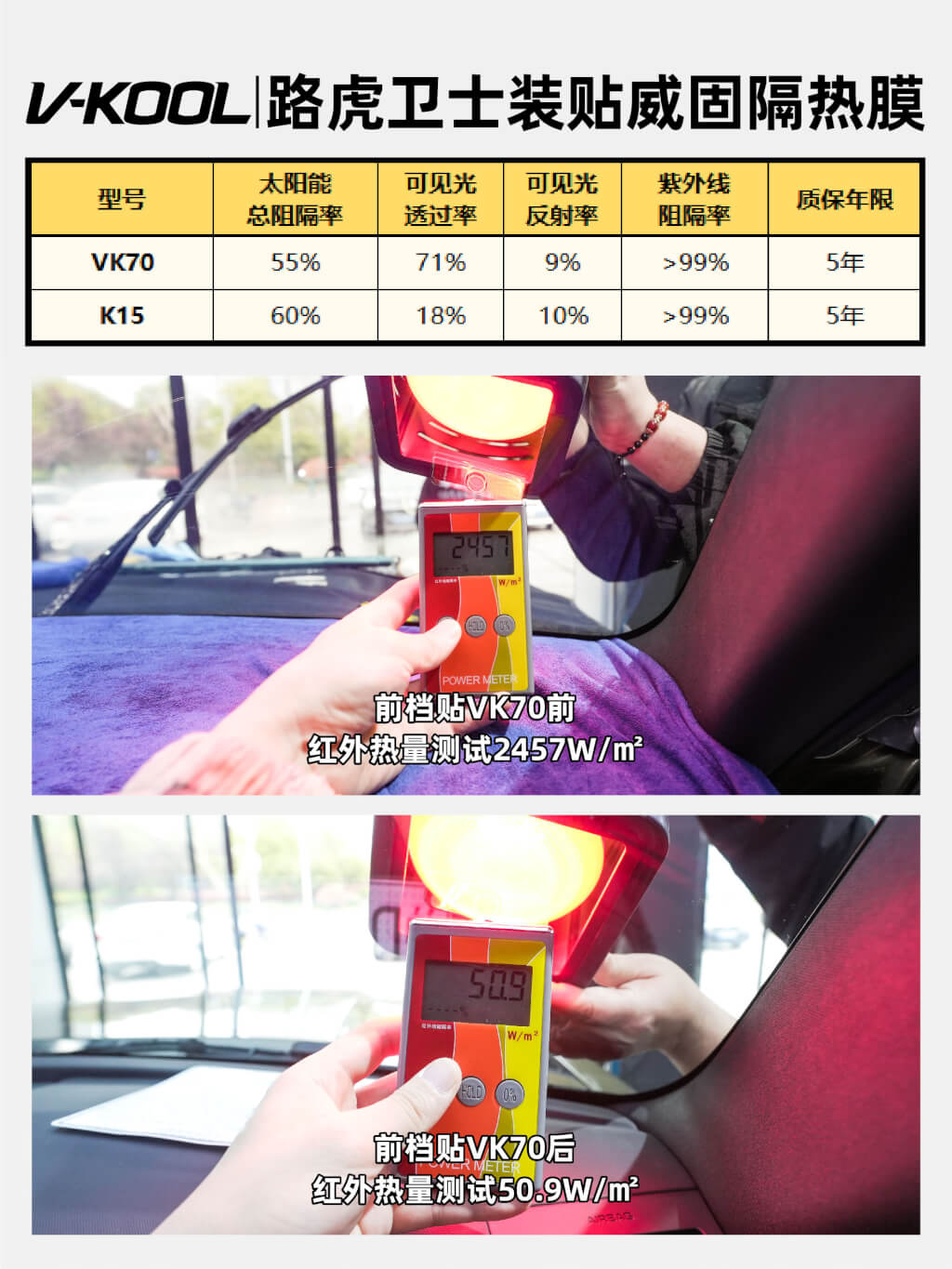 路虎卫士装贴威固VK70+K15隔热膜的隔热效果