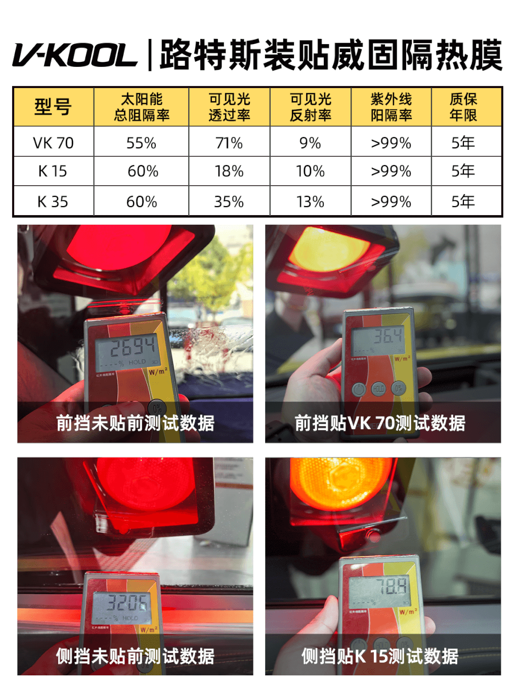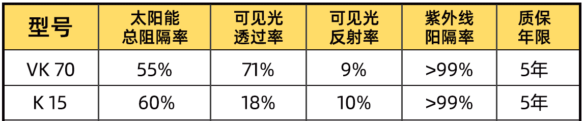 前档VK70+侧后档K15是车主们常选的威固隔热膜组合之一,其中K15是威固中隐私侧后档窗膜,可见光透过率仅18%,具有很强的隐私保护性能,是注重隐私保护的车主们的优选。