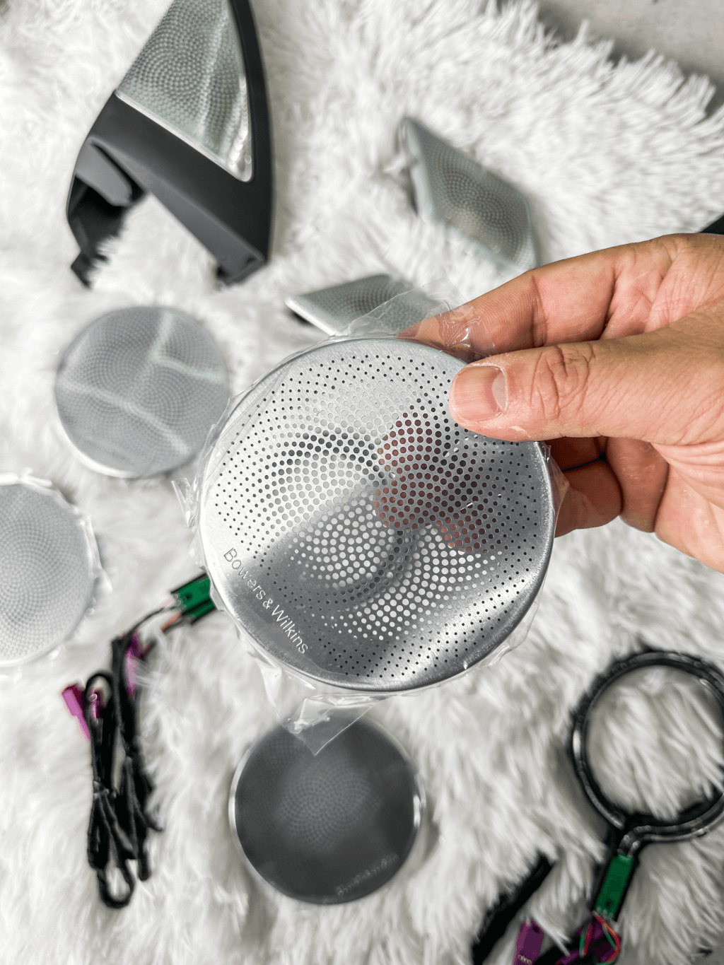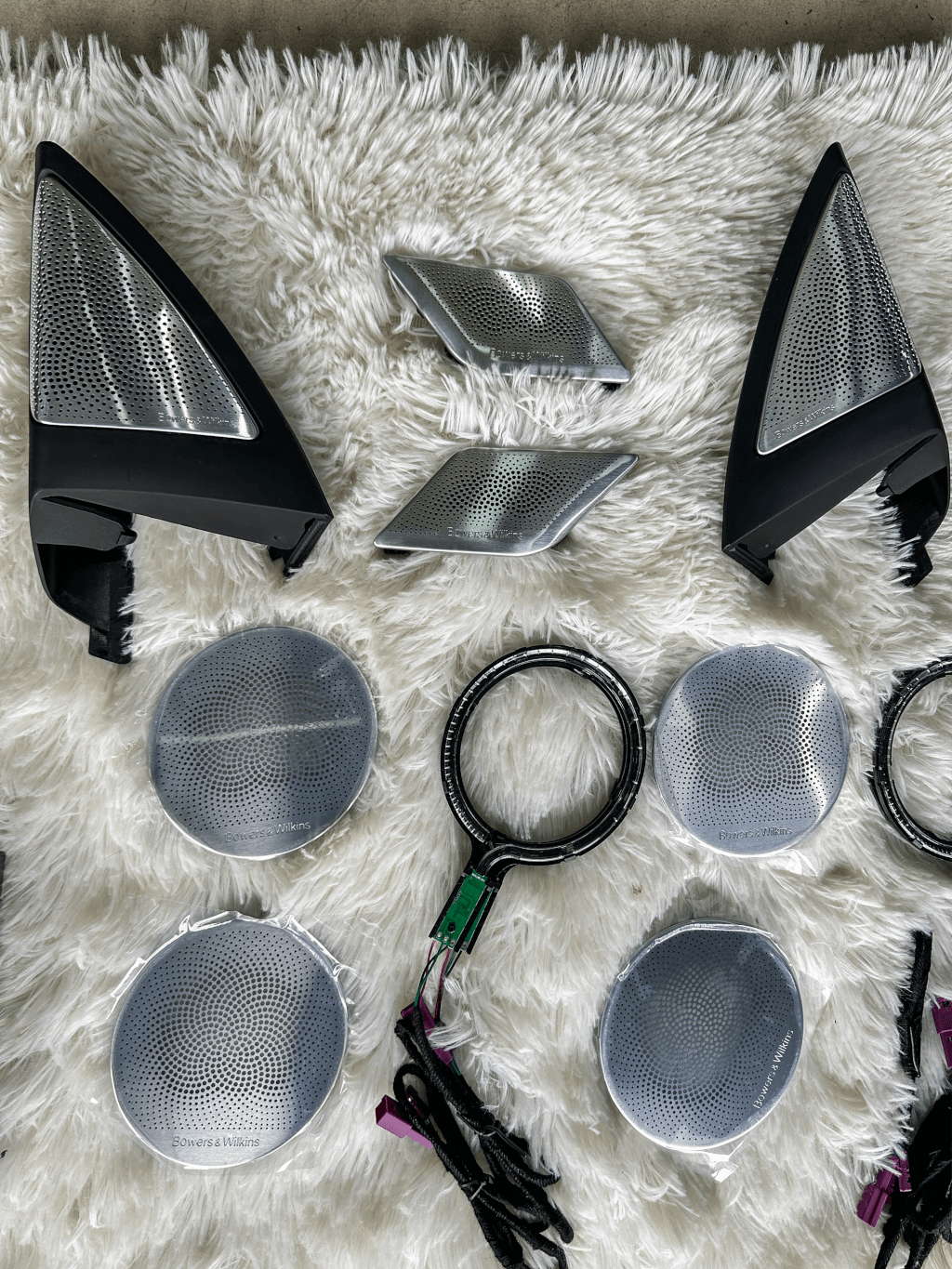 宝华韦健音响套件:包括两个鹦鹉螺钻石高音、五个普通宝华韦健高音、七个中音和两个低音,以及专用的线材和供电设备。