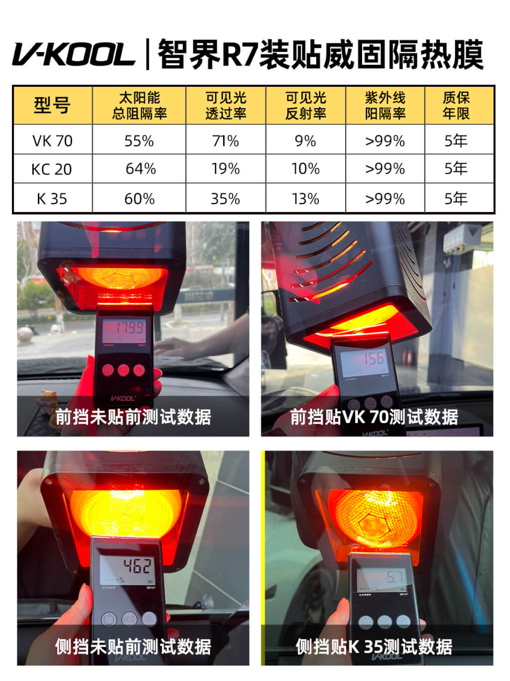 相比其他高端隔热膜品牌,威固VK70+KC20+K35系列在价格上更具优势。其出色的隔热性能和耐用性使得车主无需频繁更换,长期使用成本更低。对于智界 R7车主来说,这是一项既实用又经济的投资。