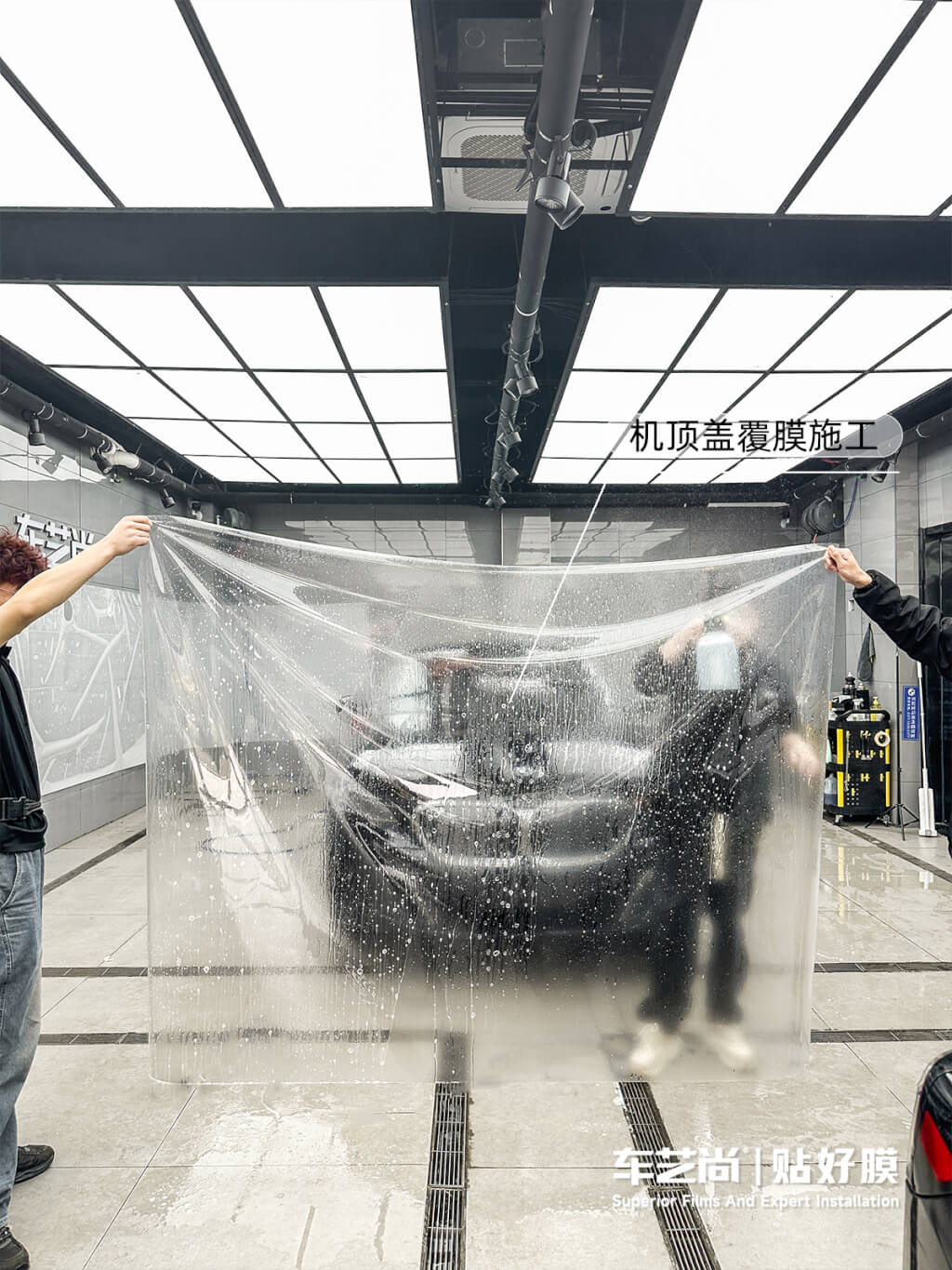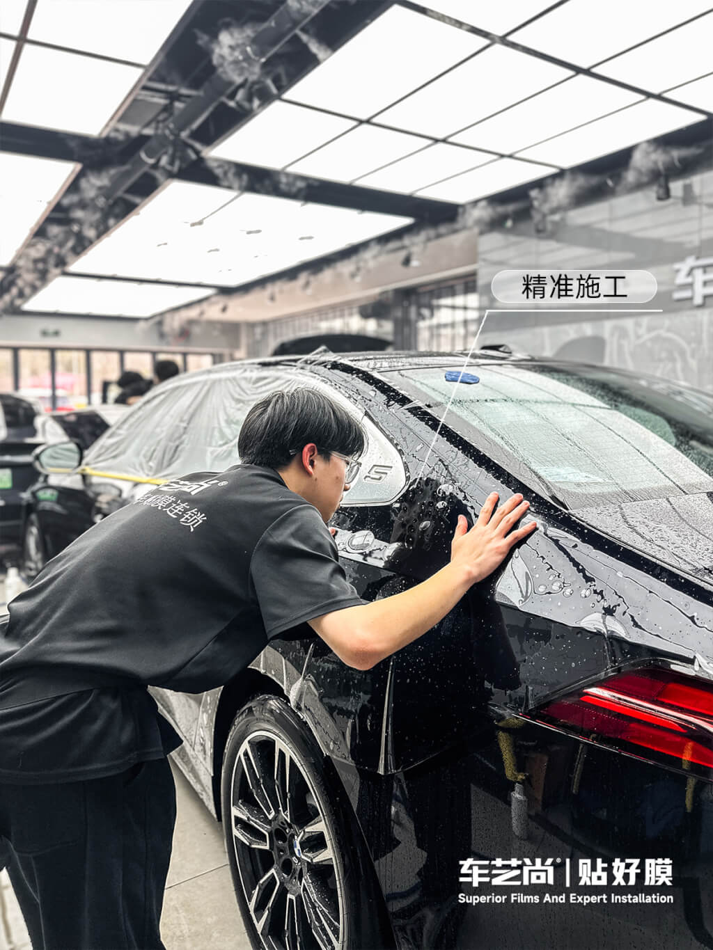 车艺尚技师需通过品牌认证+总部考核+实操测试三重筛选,平均工龄超9年,累计服务超10万台高端车型。施工中,技师运用热风塑形技术处理溜背尾门折角,精准控制膜面拉伸率(车门≤10%、保险杠≤15%),确保包边无痕、无胶纹。