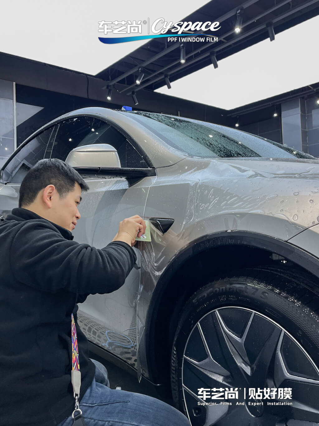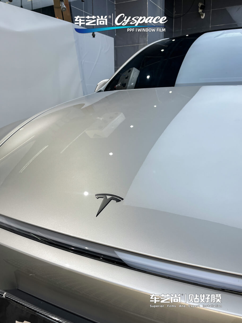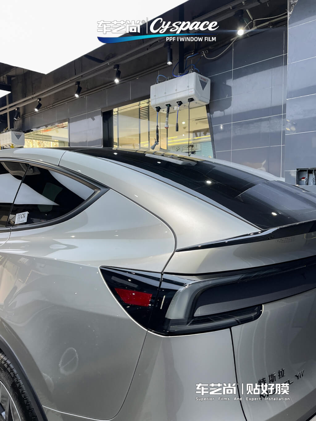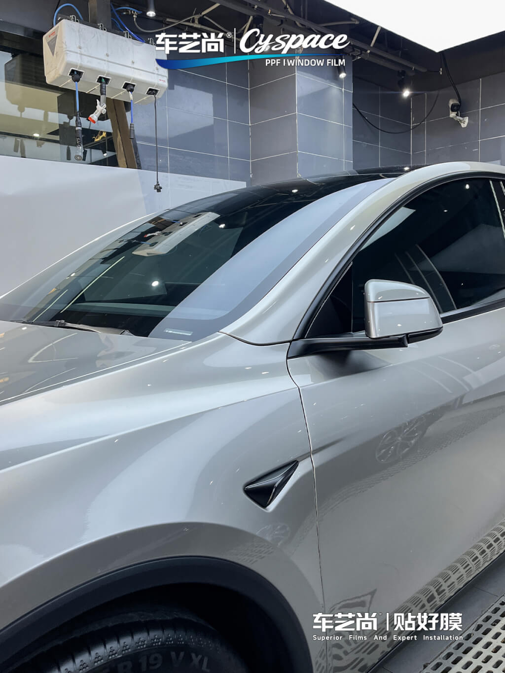 施工完成后,这台银色特斯拉 Model Y 通体流光溢彩,原厂车漆的银色质感在阳光下多了几分锐利与高级感。贴膜技师与车主一起严谨完成了功能和边角验收。
