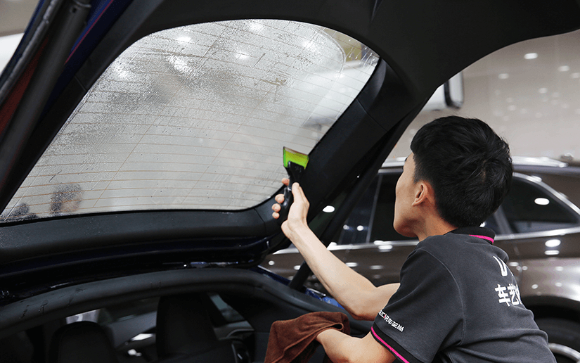 车艺尚专业技师后挡玻璃贴膜施工中