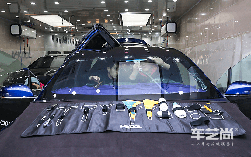 ▲车艺尚首创的垫片裁膜工艺,精裁膜过程中不会划伤您的爱车玻璃