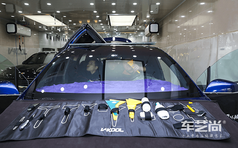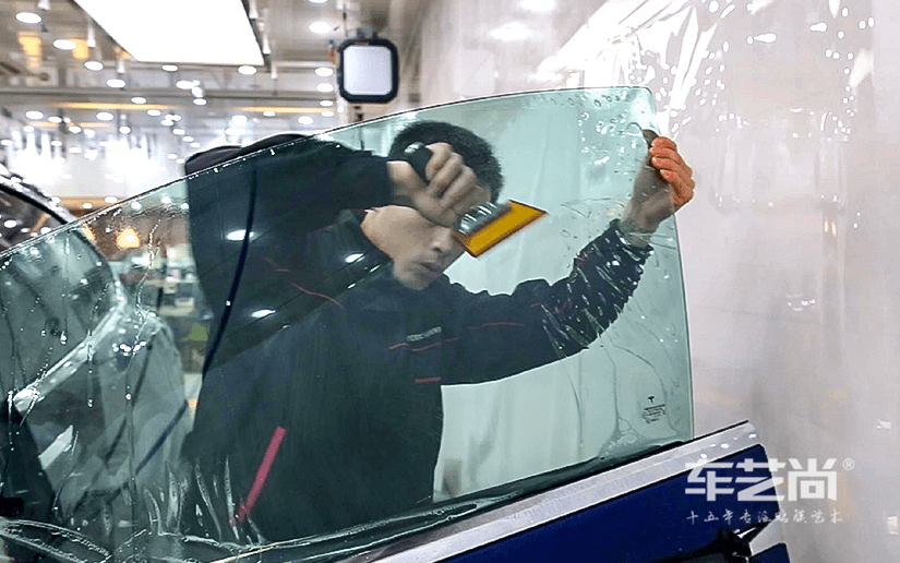 ▲汽车窗膜施工中,车艺尚采用500ML整车微水贴膜,避免电器门板受潮短路等施工伤害。