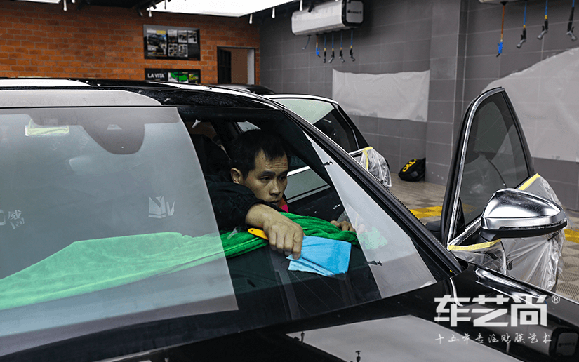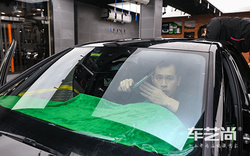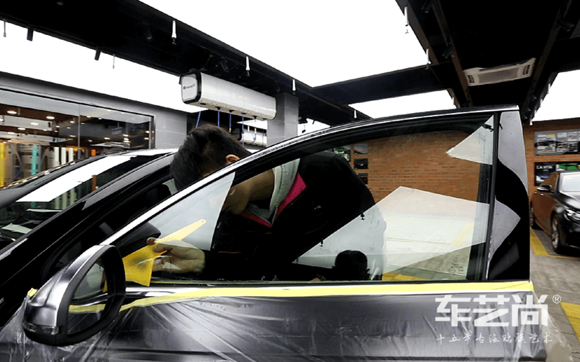 ▲汽车窗膜施工中,车艺尚采用500ML整车微水贴膜,避免电器门板受潮短路等施工伤害。