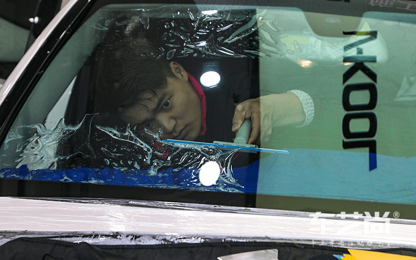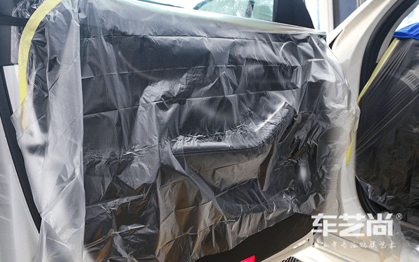 ▲汽车窗膜施工中,车艺尚采用500ML整车微水贴膜,避免电器门板受潮短路等施工伤害。