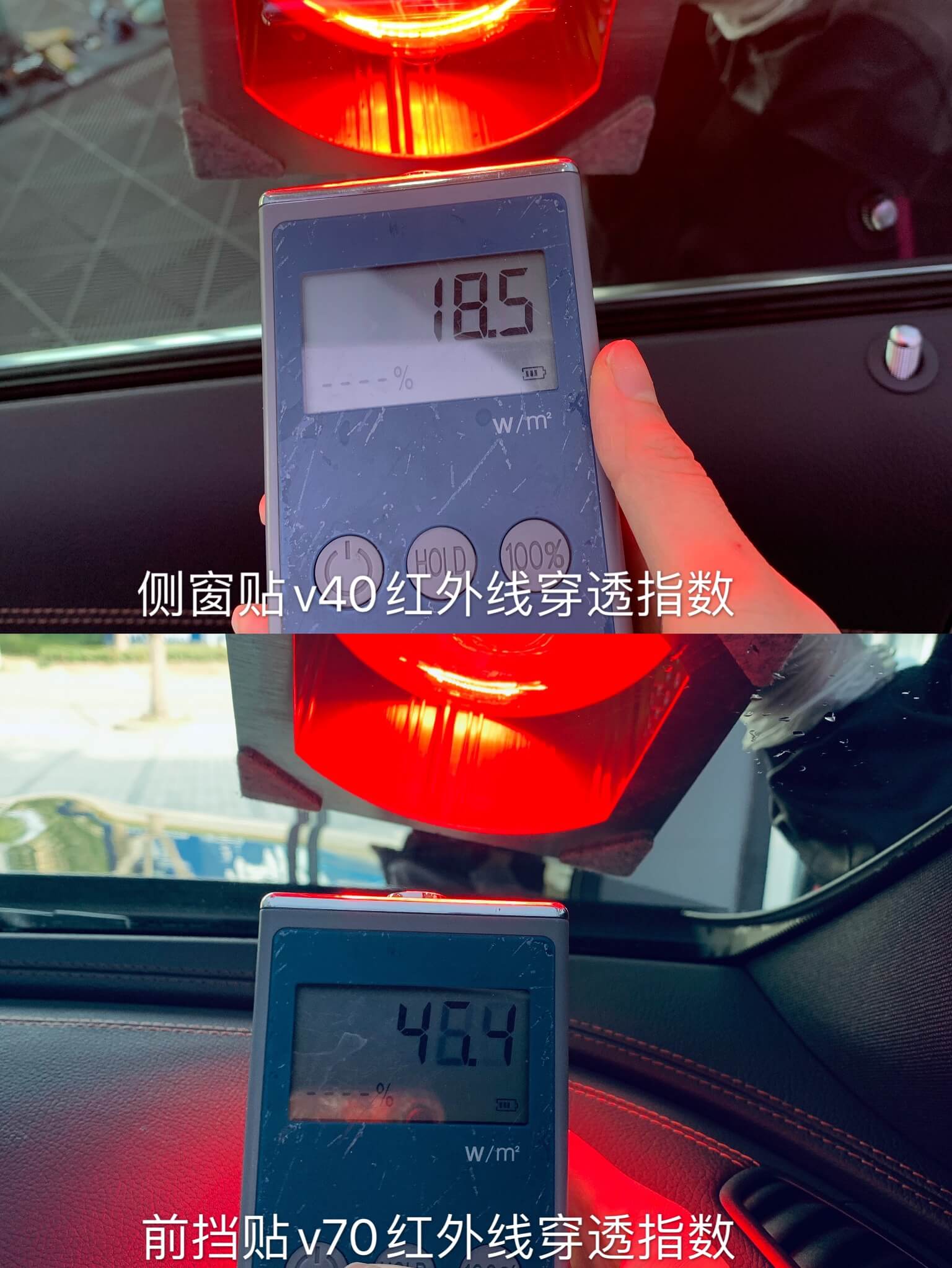 我们在车内所能感受到的大部分热量都来源于红外线,下图中仪器是能量测试仪,数字显示越高,说明隔热效果越不好,数值越低,隔热就越好。
