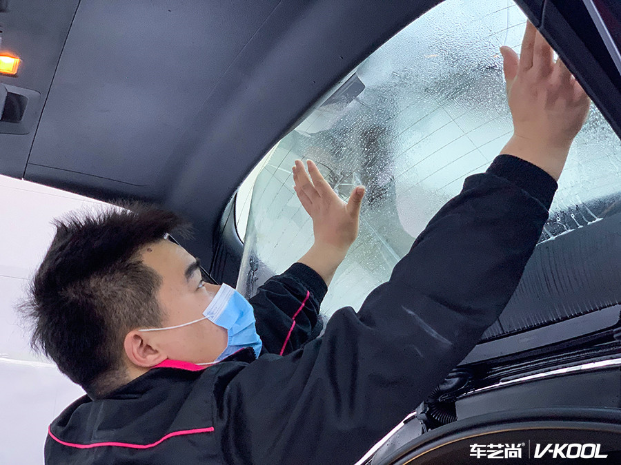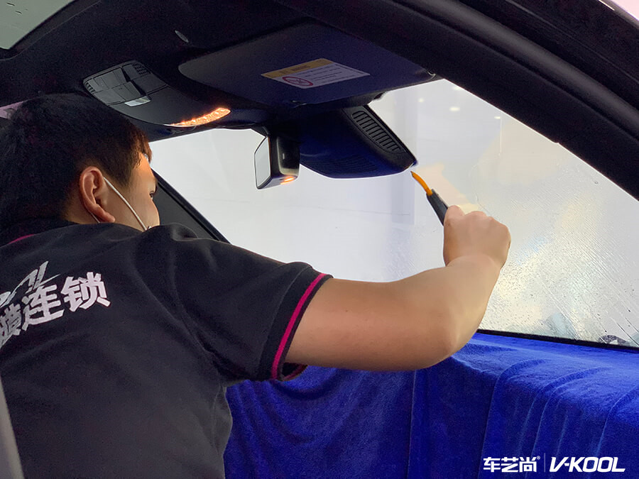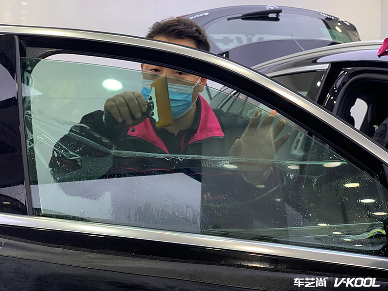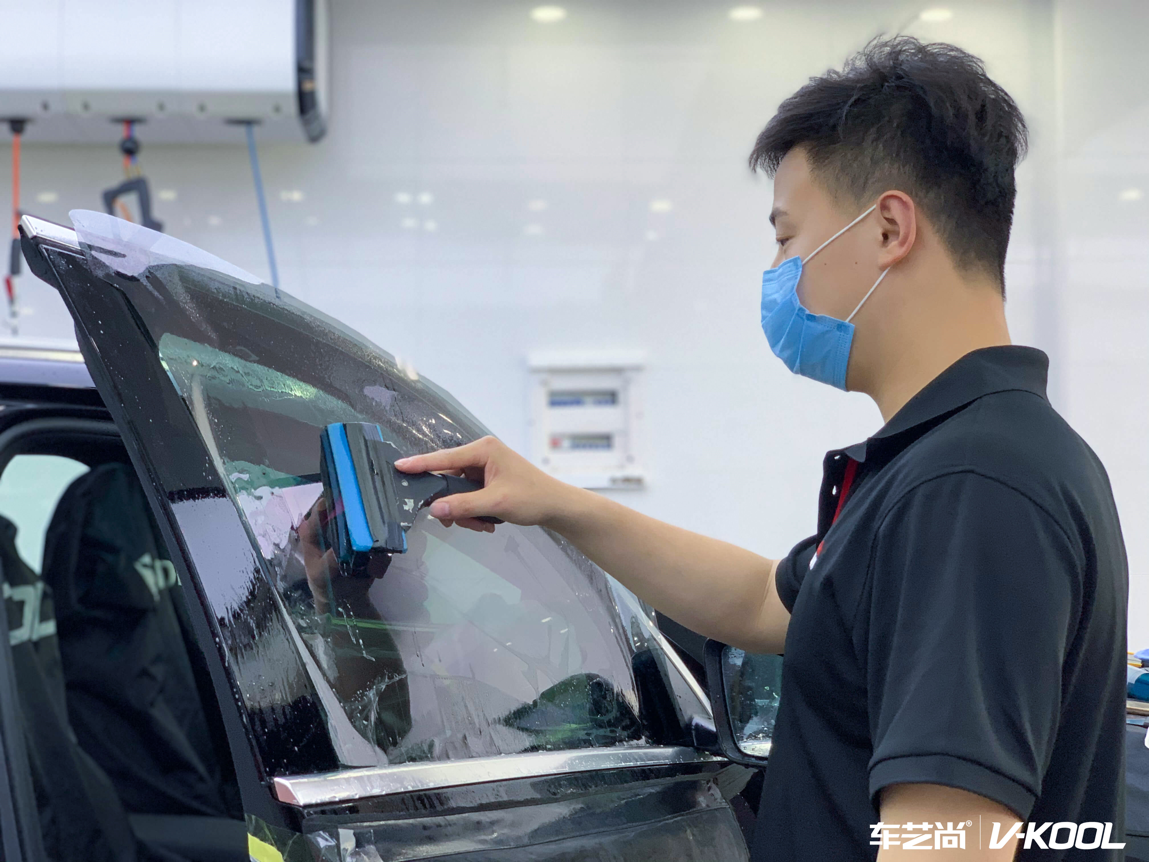 车艺尚技师不同施工部位采用不同的赶水手法与工具,确保膜与玻璃的充分贴合,无气泡、无翘边。