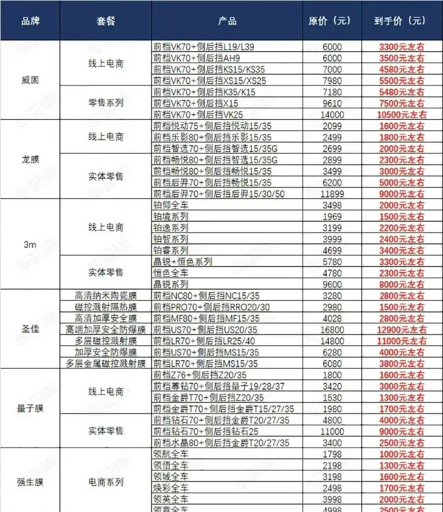 最后,附上一个市面上汽车贴膜常见价格表一份!