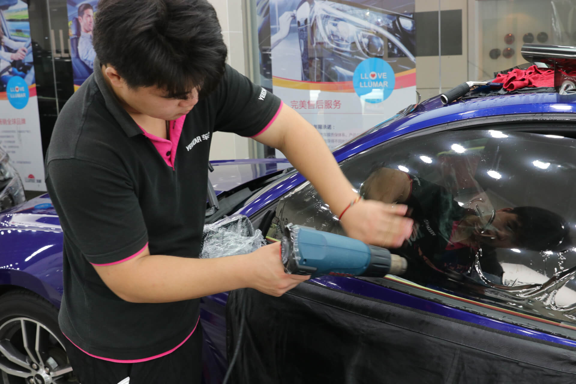 把剪裁出来的车膜用热风枪,贴合玻璃膜曲面弧度烘烤定型,过程中要注意控制好热风枪的温度,以免不当操作导致车膜熏黑或玻璃破裂。