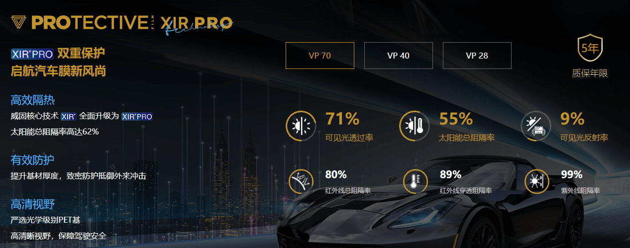 vp70是vk70的升级版,同样是金属膜,质保5年,厚度4mil,太阳能总阻隔率55%,可见光透过率71%,可见光反射率为9%,紫外线阻隔率99%以上,主打的是防爆性能,提升基材厚度,致密防护抵御外来冲击,严选光学级别PET基,高清晰视野,保障驾驶安全。