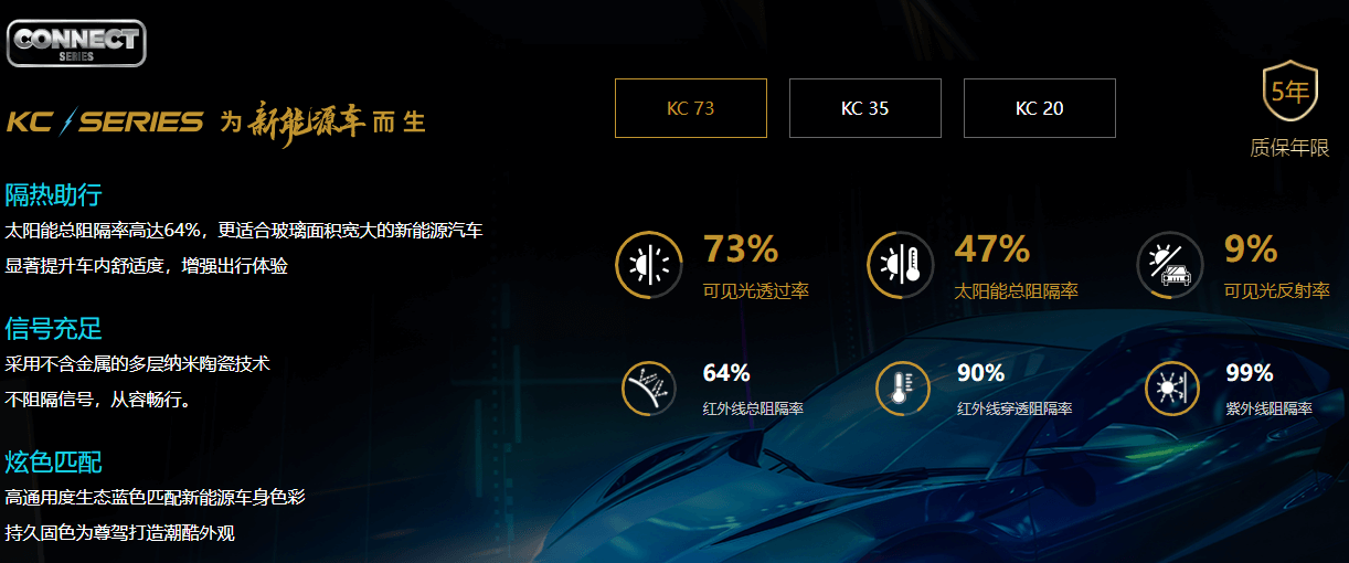 kc70是纳米陶瓷膜,质保5年,厚度2.5mil,太阳能总阻隔率47%,可见光透过率73%,可见光反射率为9%,紫外线阻隔率99%以上,kc70更适合玻璃面积宽大的新能源汽车,显著提升车内舒适度,增强出行体验,采用不含金属的多层纳米陶瓷技术,不阻隔信号,从容畅行。