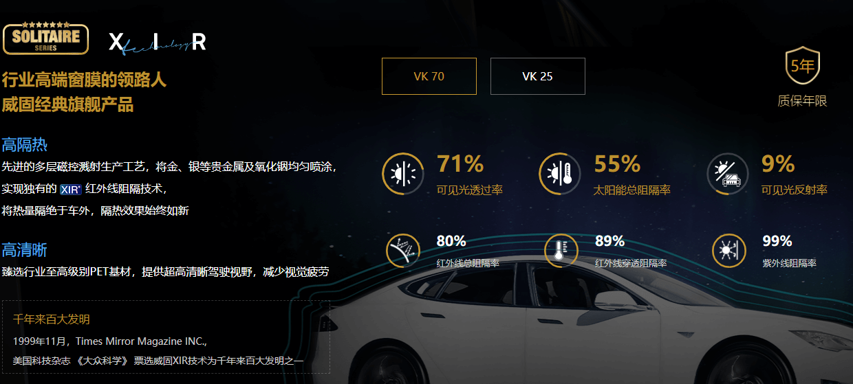 vk70是金属膜,质保5年,厚度1.5mil,为威固的顶级膜,太阳能总阻隔率55%,可见光透过率71%,可见光反射率为9%,紫外线阻隔率99%以上,主打的是高隔热,高透光,提供超高清晰驾驶视野,减少视觉疲劳。