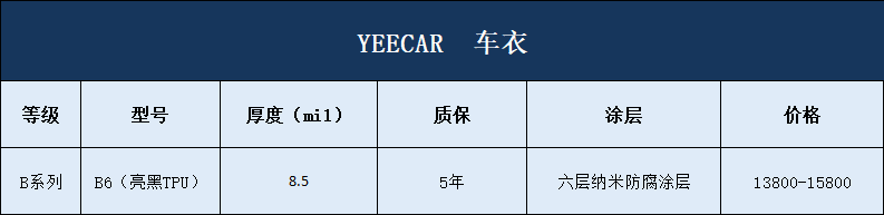 市面上的亮黑车衣其实并没有透明车衣种类丰富,其中具有代表性的是艺卡YEECAR亮黑车衣B6,采用A级母粒,Argotec脂肪族聚己内酯型TPU,具有六层纳米防腐涂层,Ashland高清可移胶。