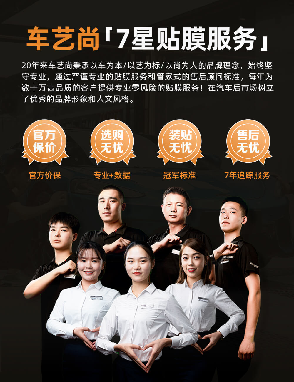 车艺尚40+门店全国连锁,20年运营服务,一店贴膜,全国联保,在车艺尚任意一家门店均可享受同等售后服务。车艺尚龙岗旗舰店为每位车主配备了专属客服,贴膜后如果出现任何问题都可以联系专属客服处理。实力缔造品质,为您的爱车保驾护航。