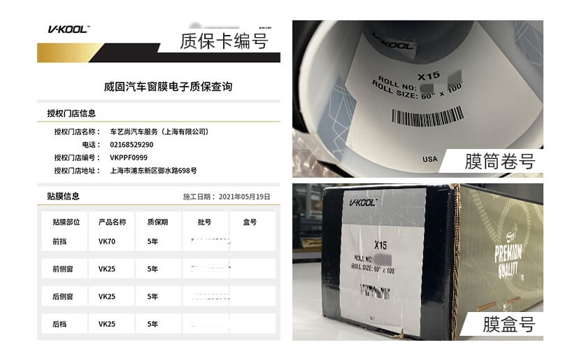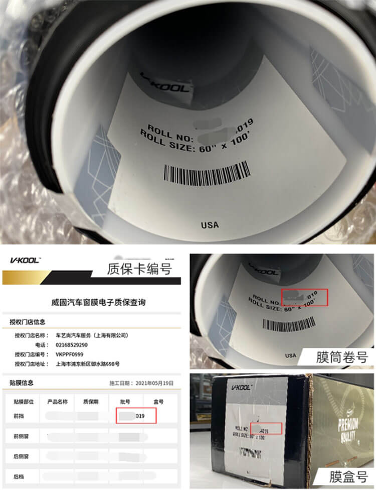 如果门店是正规的,那么产品肯定也是正规的,通过判断店内车膜产品是否是威固正品车膜也能帮助判断门店的真伪。正品威固车膜均符合三码合一,即盒号编码、覆膜层编码以及质保卡批号编码是一致的,在贴膜前一定要仔细对比,稍有不同就是假膜,可拒绝施工贴膜。
