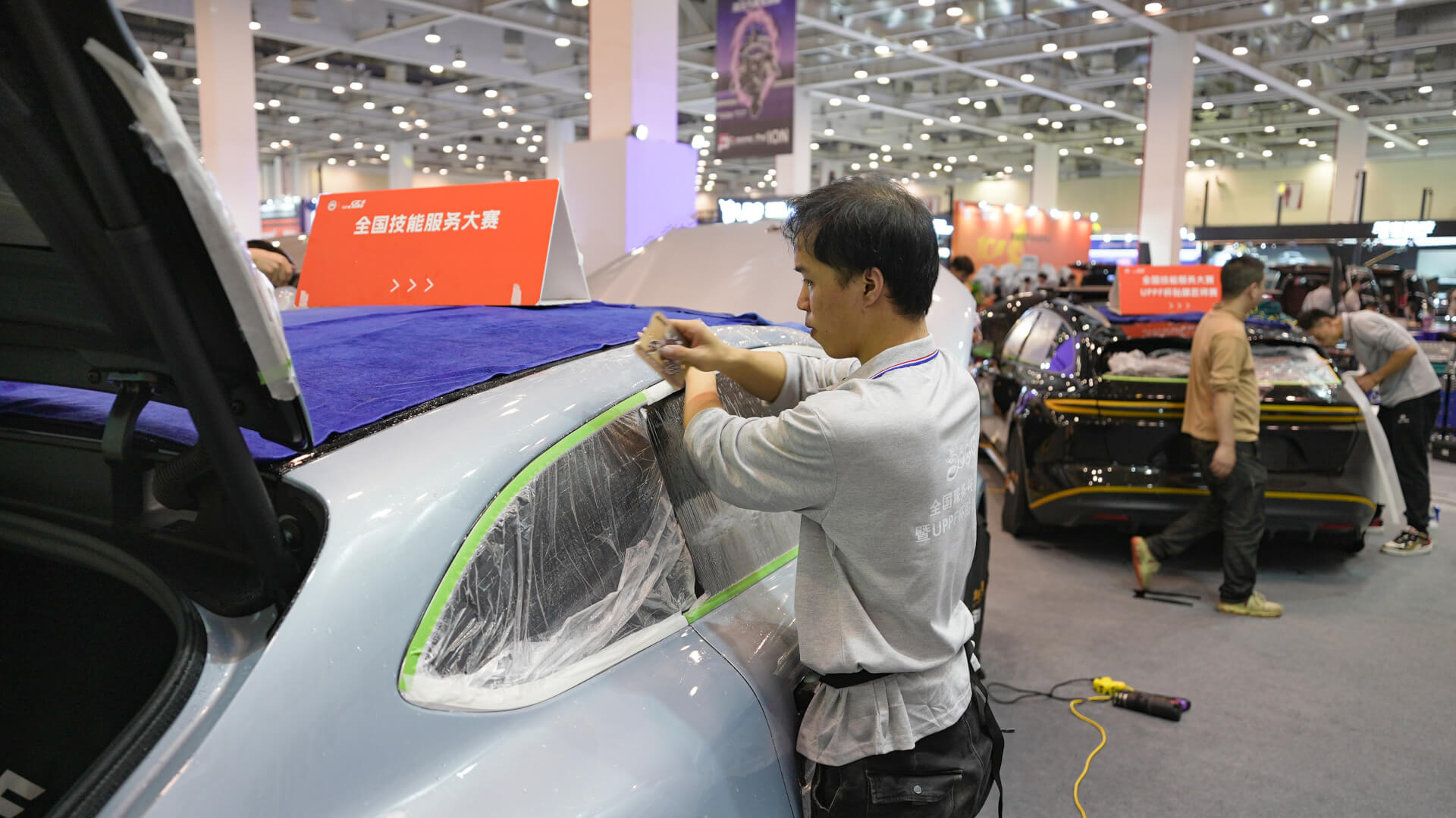 比赛中,选手们需要在规定时间内完成车辆的清洗、裁量、贴膜等多项任务。期间,车艺尚参赛匠师更是展现出了扎实的技能功底,特别是车艺尚带来的更专业的贴膜配套工具,在贴膜过程中,对车衣和改色膜的装贴游刃有余,引来了诸多观众驻足观望。