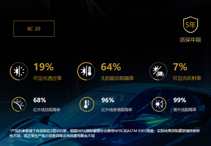 可见光反光率:KC20的反光率最低,有助于减少车内的眩光,希望坐在后面对外看时清晰度稍微高一点的车主可选。
