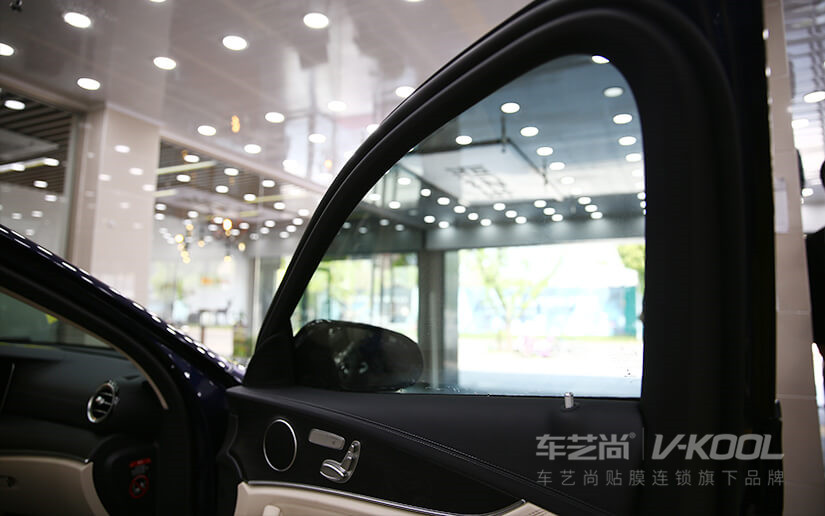 奔驰E的后排玻璃属于是深黑色的隐私玻璃,如果在乎整体美观和实际的使用,它的侧后挡适合贴颜色稍浅的膜,后排不至于太暗,前排也不会影响后视镜观察,在授权店的零售产品中,符合这些要求的威固膜型号有V40和K28,最终选择了K28作为侧后膜的原因是因为这辆奔驰E是蓝色车漆,贴颜色深些的隔热膜会更加美观。
