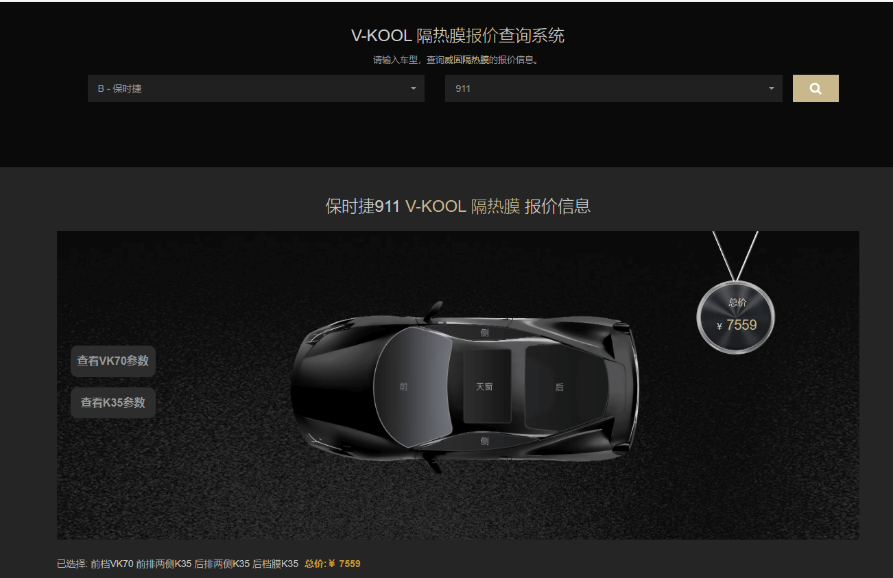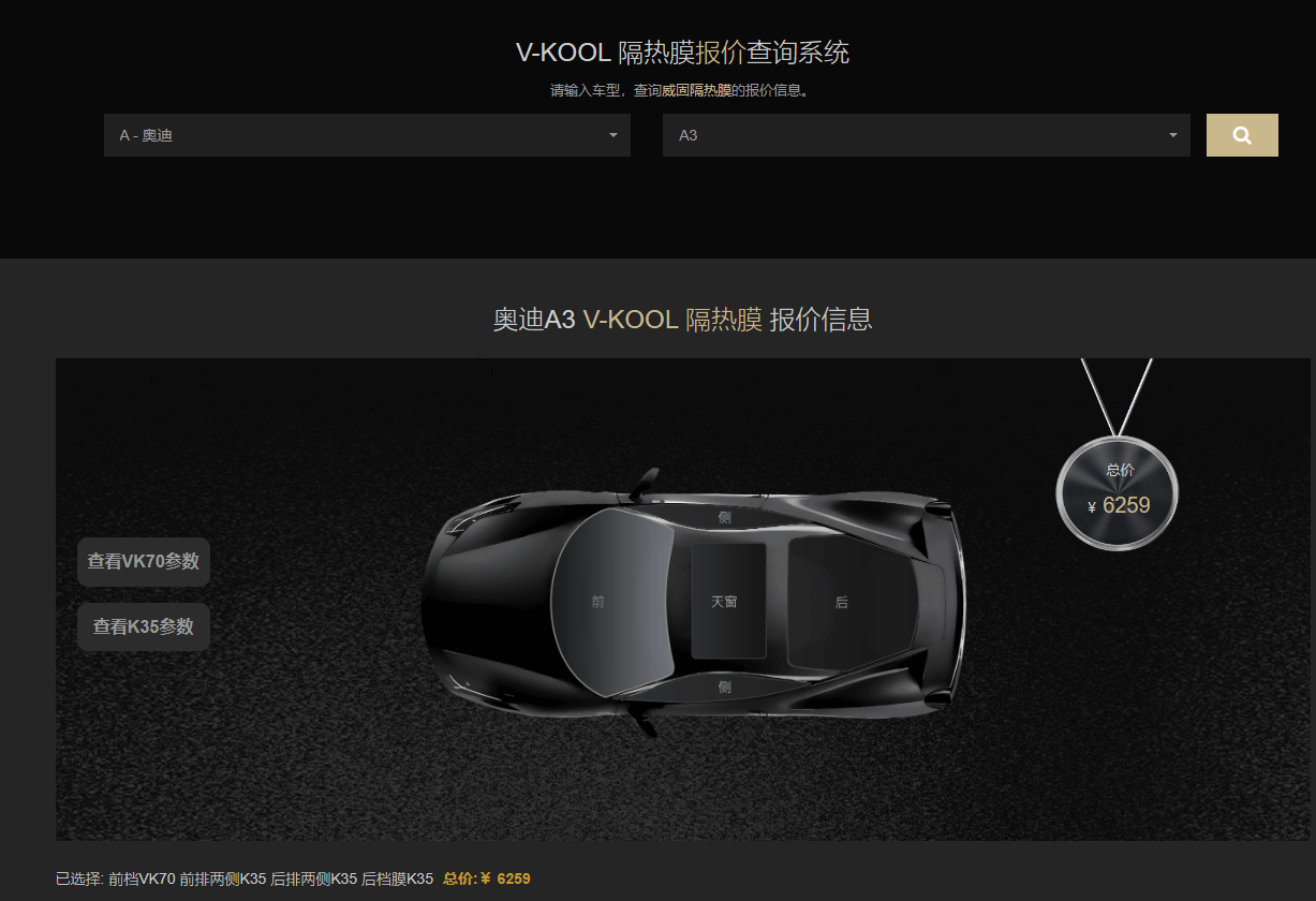 威固有报价系统, 大家可以通过报价系统来评估自己爱车的贴膜价格,选择车型和威固隔热膜类型后点击搜索即可。