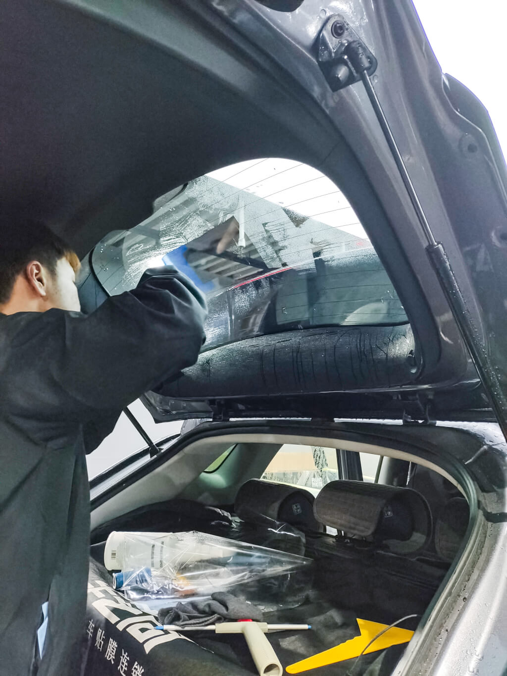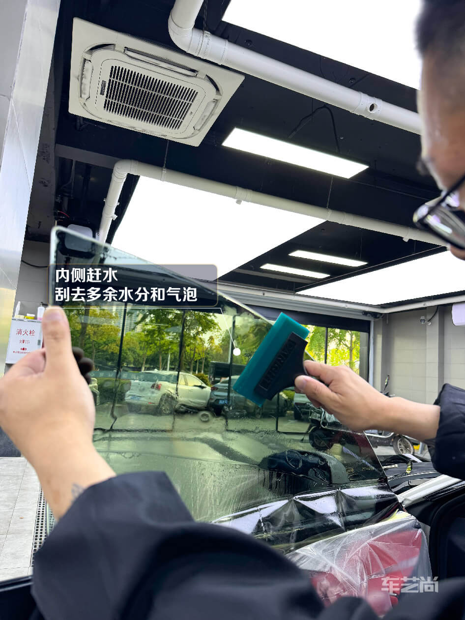 车艺尚技师用专业的赶水工具对每片膜逐个细心赶水,去除多余水分,让膜与玻璃紧密贴合,同时减少残留水分,避免造成车内潮湿。