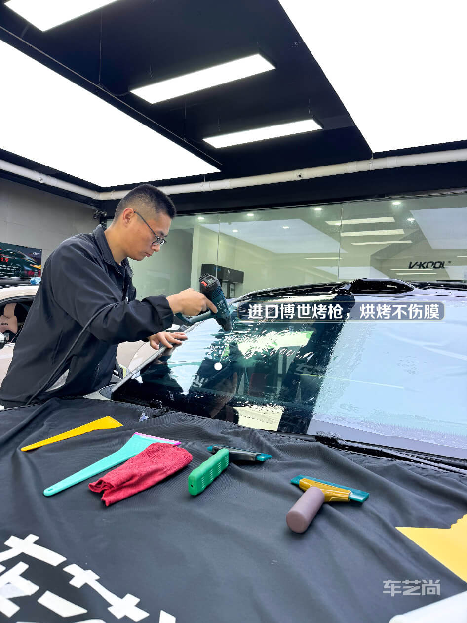 使用德国进口恒温烤枪进行膜面烘烤,技师运用准确的手法控制烘烤的距离与时长,在保障膜材的延展性不受损,车膜定型的同时,不留一丝多余水分。
