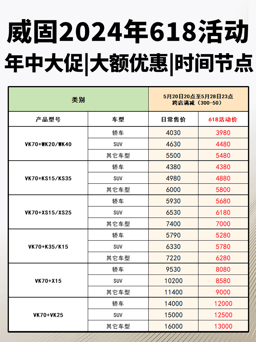 威固车衣价格普遍偏高,日常价格范围在8800-100000左右。在618活动期间购买威固隐形车衣,会得到更多的商品券、优惠券,平台会员券额度也会变得非常大,相互叠加使用可以节省不少花费,可以说是近半年的抄底价,有些平台和商家还会送上更多的赠品福利。所以,想贴威固车衣的车友们,618决不能放过!