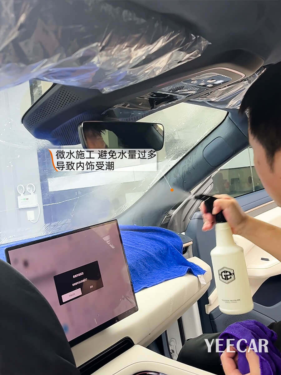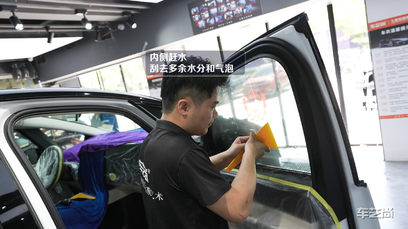 微水施工:全车只采用少量水贴汽车膜,减少大量水分可能对车辆内饰、电路系统等造成的潮湿和短路风险。