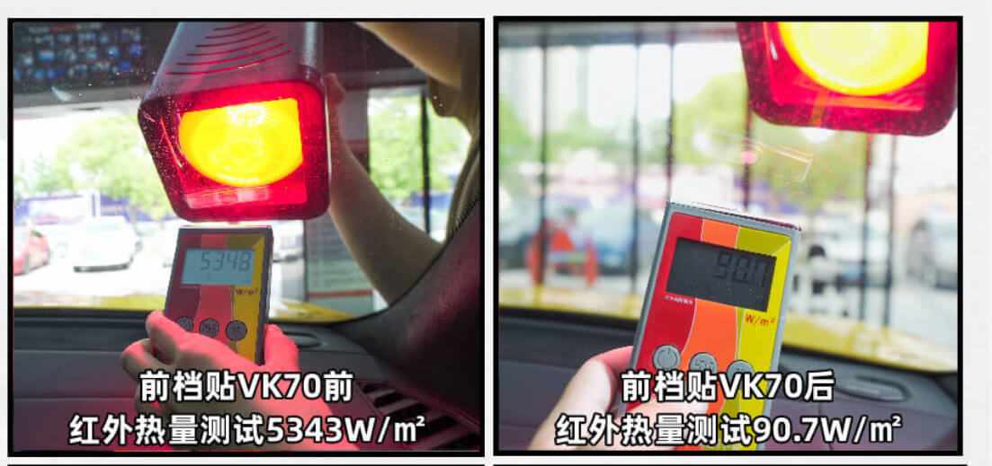 VK70透光率为71%,畅悦80的透光率高达79%,相比之下畅悦80的透光率更高,所以会更亮、更清晰,喜欢前挡高亮、高清晰的车主可选畅悦80。VK70和畅悦80的可见光反射率均为9%,都能强效防眩光,提供高清驾驶视野,均可保障外出驾驶安全。