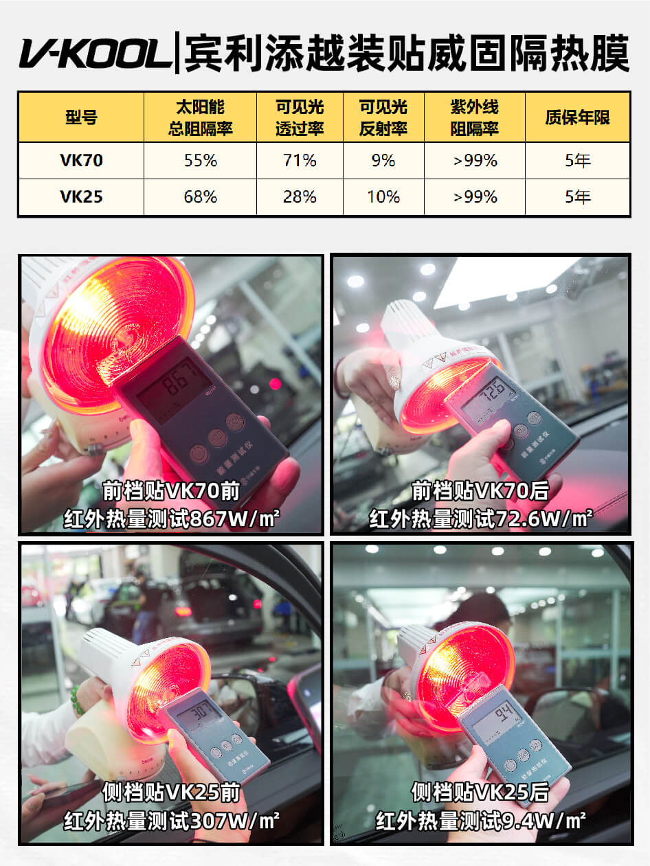 相比VK70,侧后挡汽车膜VK25的透光率较低,但隔热效果更为显著,太阳能总阻隔率高达68%,特别适用于需要更高私密性和更强隔热性能的车窗部位。