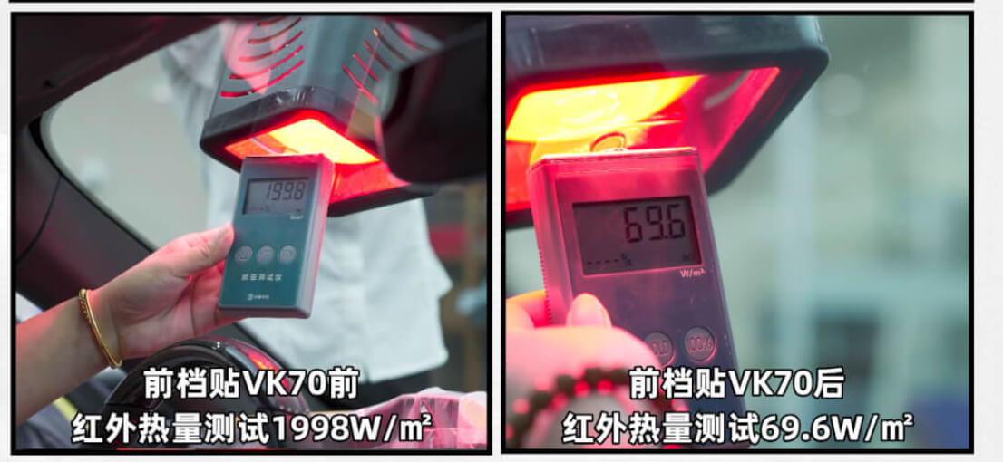 法拉第SF90贴威固VK70前后红外热量测试,贴膜前数值为1998w/㎡,贴完VK70后测试数据为69.6w/㎡,阻隔热量效果非常强。