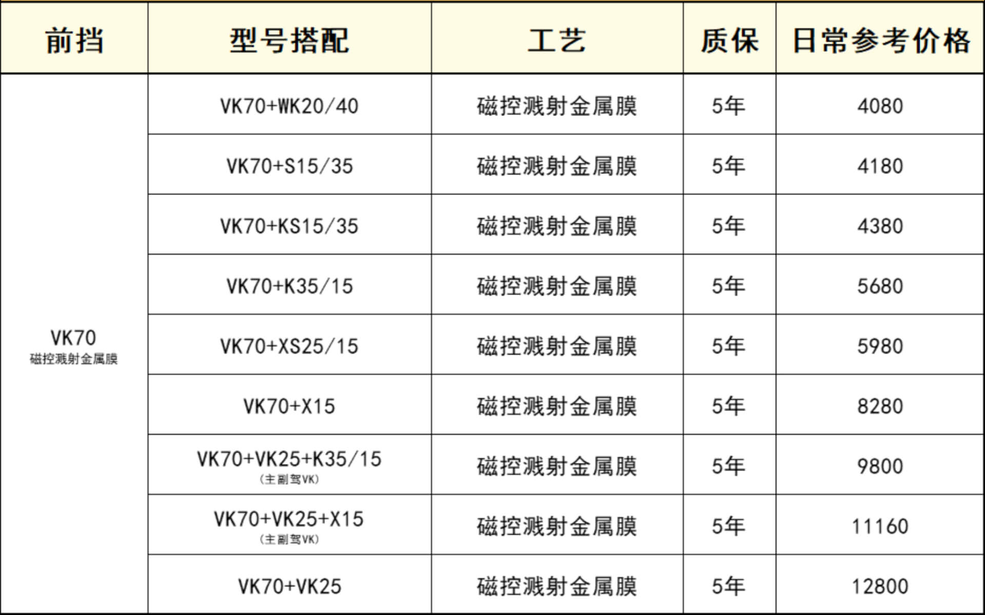 四、威固车膜vk70常用全车贴膜搭配及价格表