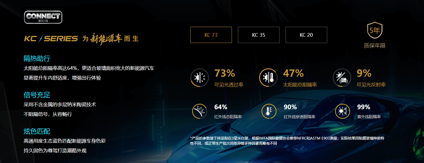 KC73是威固纳米陶瓷膜的代表,不干扰信号,适合新能源车。K35/15侧后挡磁控溅射金属膜,提供一定的隐私保护与隔热性能
