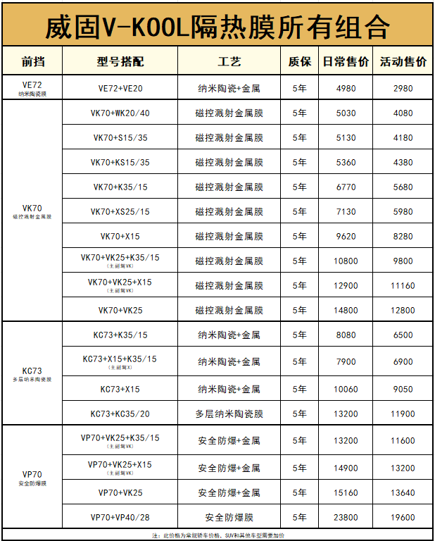 VK70:这是威固的经典前挡膜型号,采用磁控溅射贵金属膜技术,具有良好的隔热和透光性能。