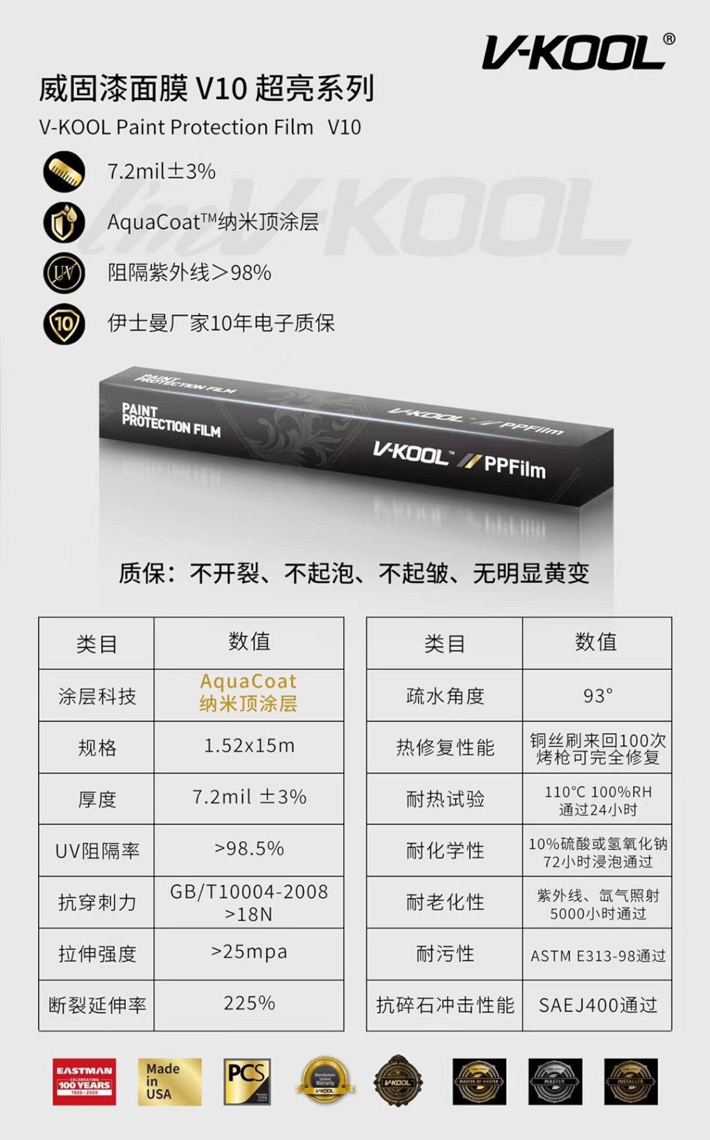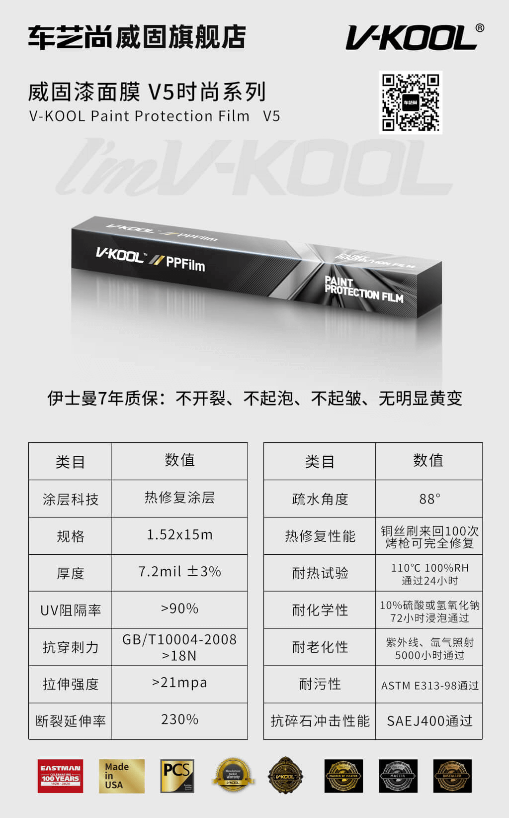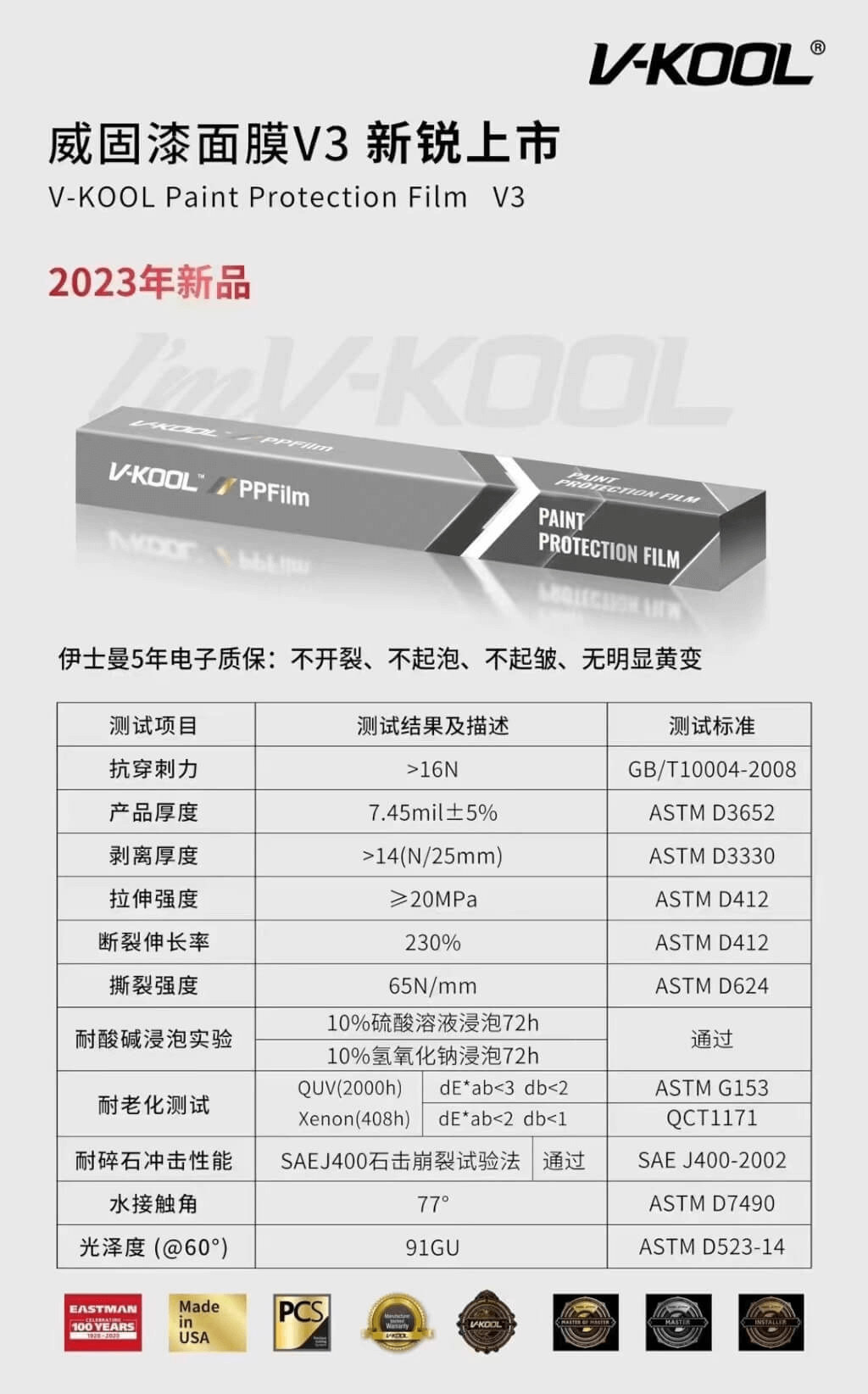 V5:V5的厚度为7.2mil,使用热修复涂层,质保7年,提供强劲的防刮耐磨性能。