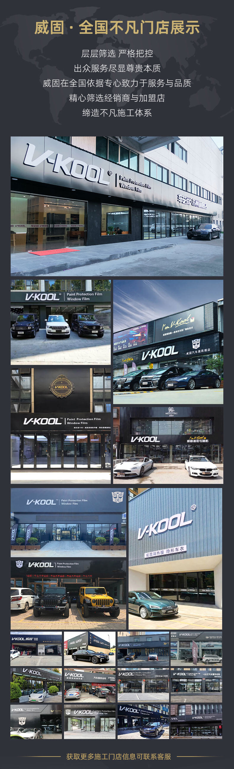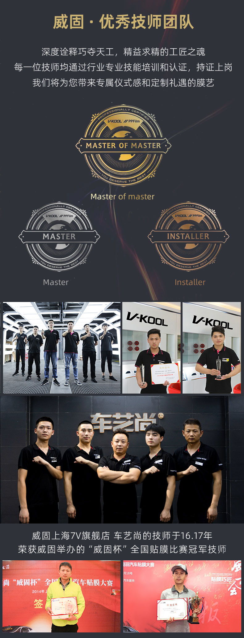 7V不凡门店:这是威固门店中的高等级,提供高级的服务和设施。7V门店必须有Master of Master认证技师坐镇,并且拥有售卖威固V1000车衣膜的权限。
